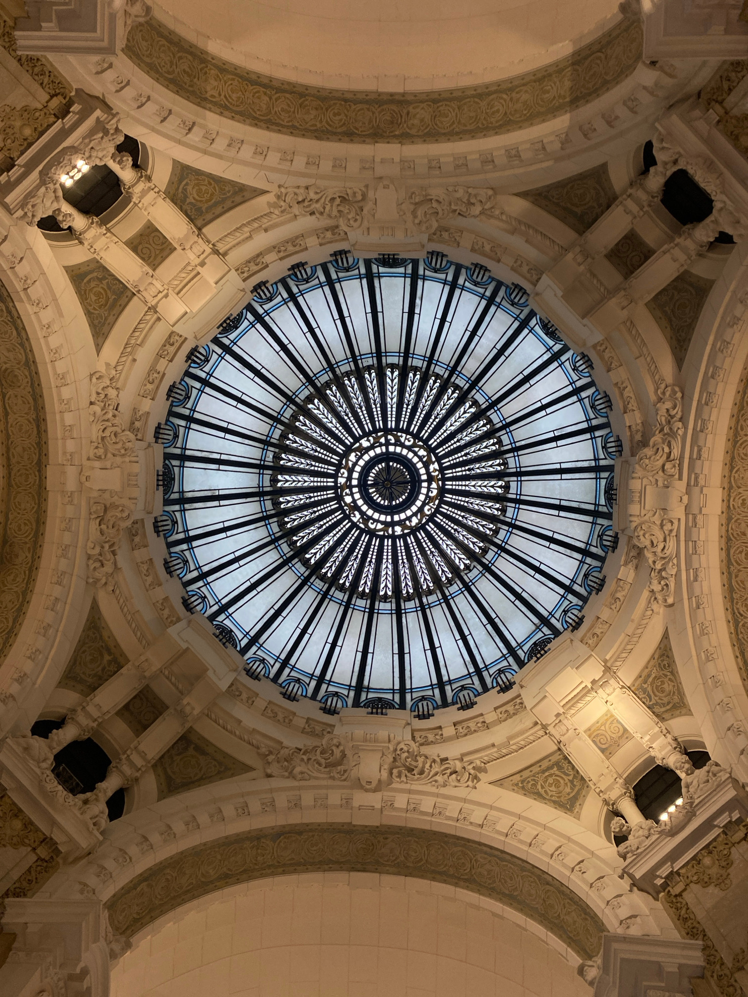 The image depicts the elaborate stained-glass dome of Galerías Pacífico, a shopping mall located in Buenos Aires, Argentina. The dome features a radial design with alternating clear and dark panels, s…read more