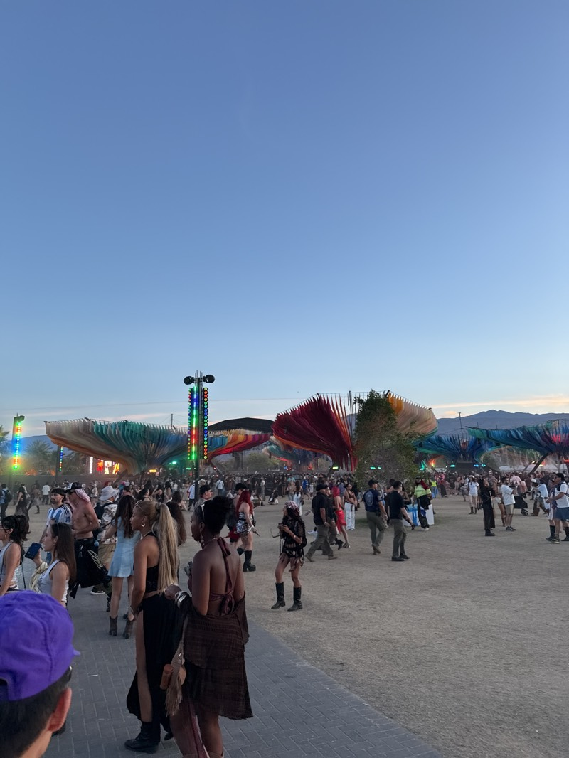 The image shows a large crowd of people at the Coachella Valley Music and Arts Festival in Indio, California, United States. The festival grounds are visible in the background, featuring colorful, lar…read more