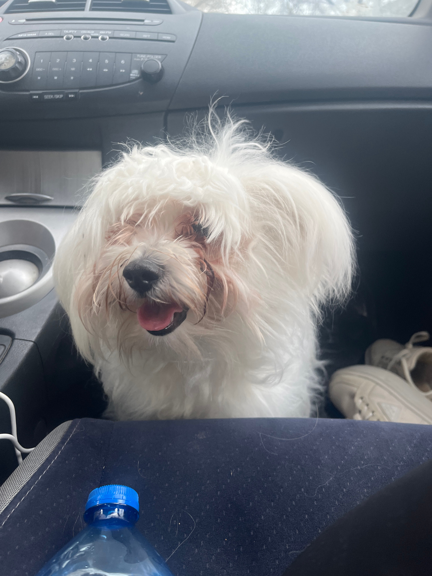 A white Maltese dog sits in the passenger seat of a car. The dog's tongue is visible. To the left, the car's radio and air vents are visible. To the right, a navy blue seat and a plastic water bottleβ¦read more