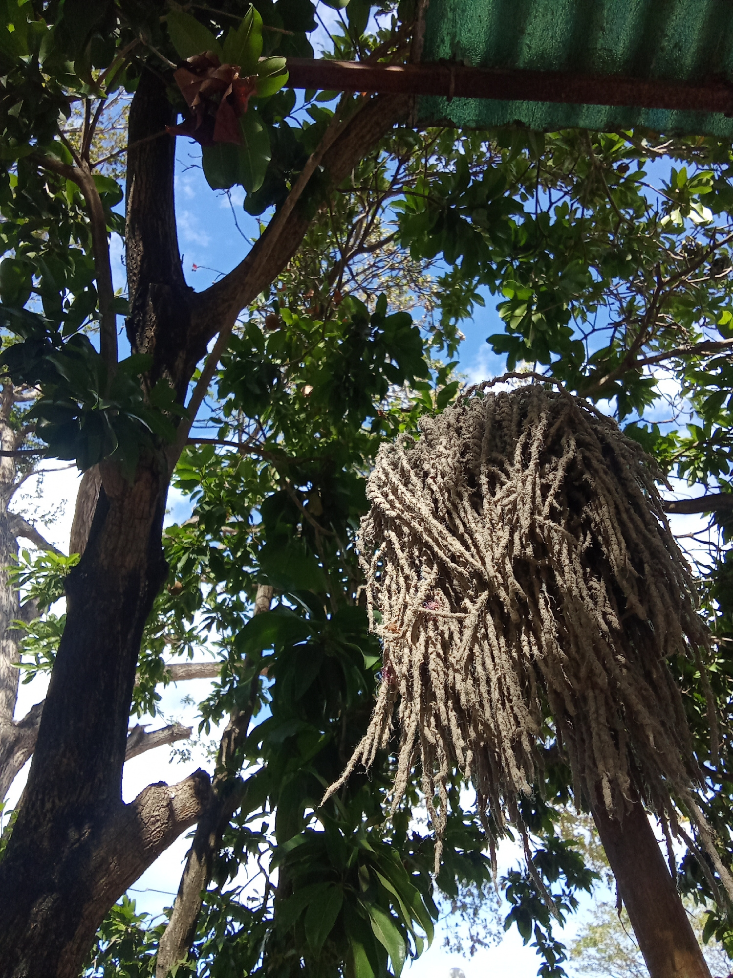 The image depicts a scene in Juan Griego, Venezuela, featuring a dense cluster of hanging palm flowers, possibly from a Caryota urens tree. The inflorescence dominates the foreground, appearing almost…read more