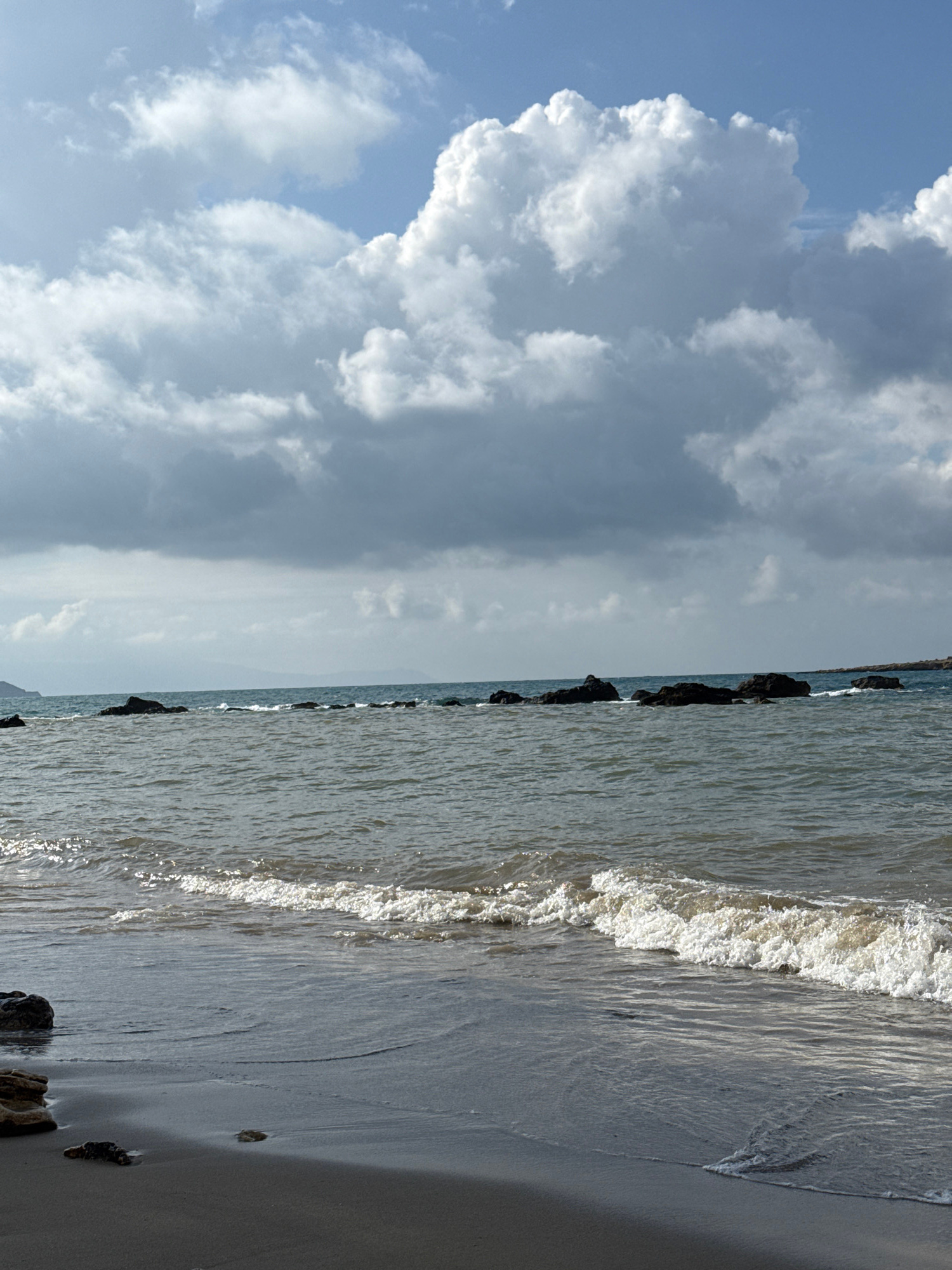 The image shows a beach scene in Chania, Greece. The view is oriented vertically, with the sky and clouds on the left and the sea and beach on the right. The sky occupies a significant portion of the…read more