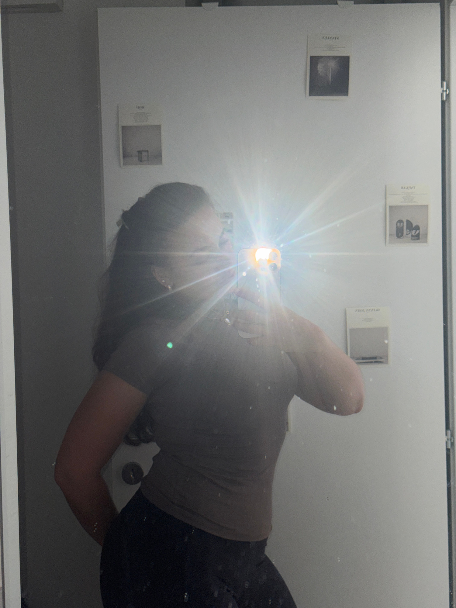 This image is a mirror selfie taken by a person in an indoor setting in Milan, Italy. The central subject is the reflection of the person, holding a smartphone with its flash activated, which creates…read more