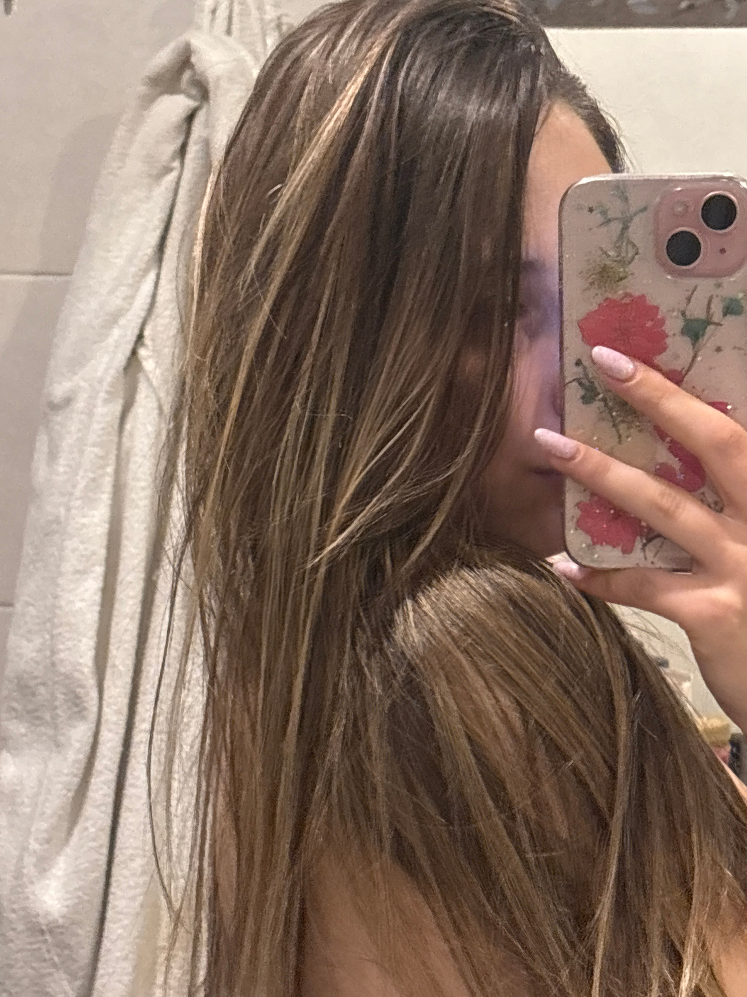The image is a close-up, horizontally oriented mirror selfie, featuring a person's head, hand, and hair. A person, likely female, is partially visible, with her face mostly obscured by a smartphone he…read more