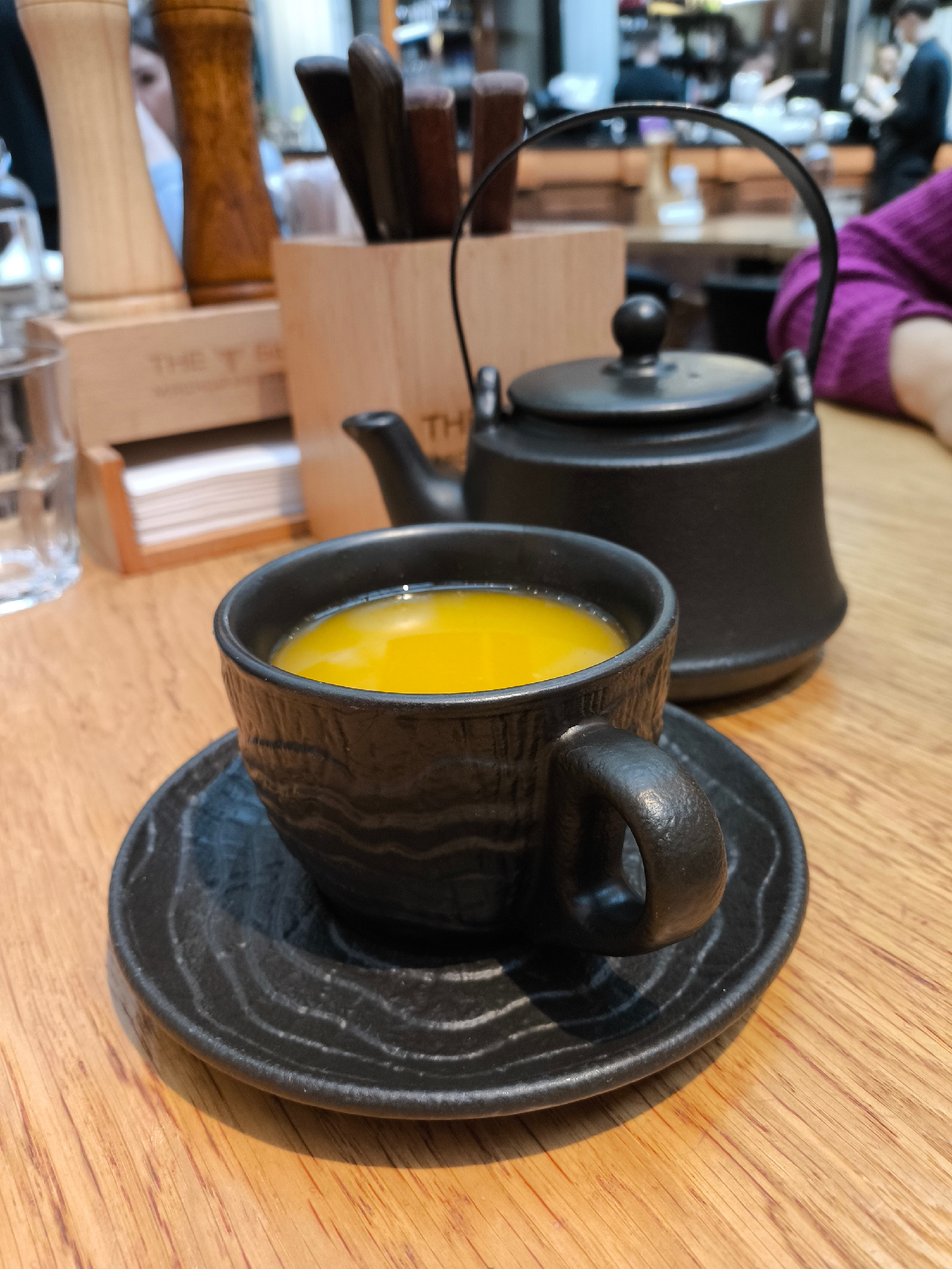 The image depicts a black ceramic tea cup and saucer, filled with yellow tea, alongside a black teapot on a wooden table. In the background, there's a wooden container holding utensils, a glass of wat…read more