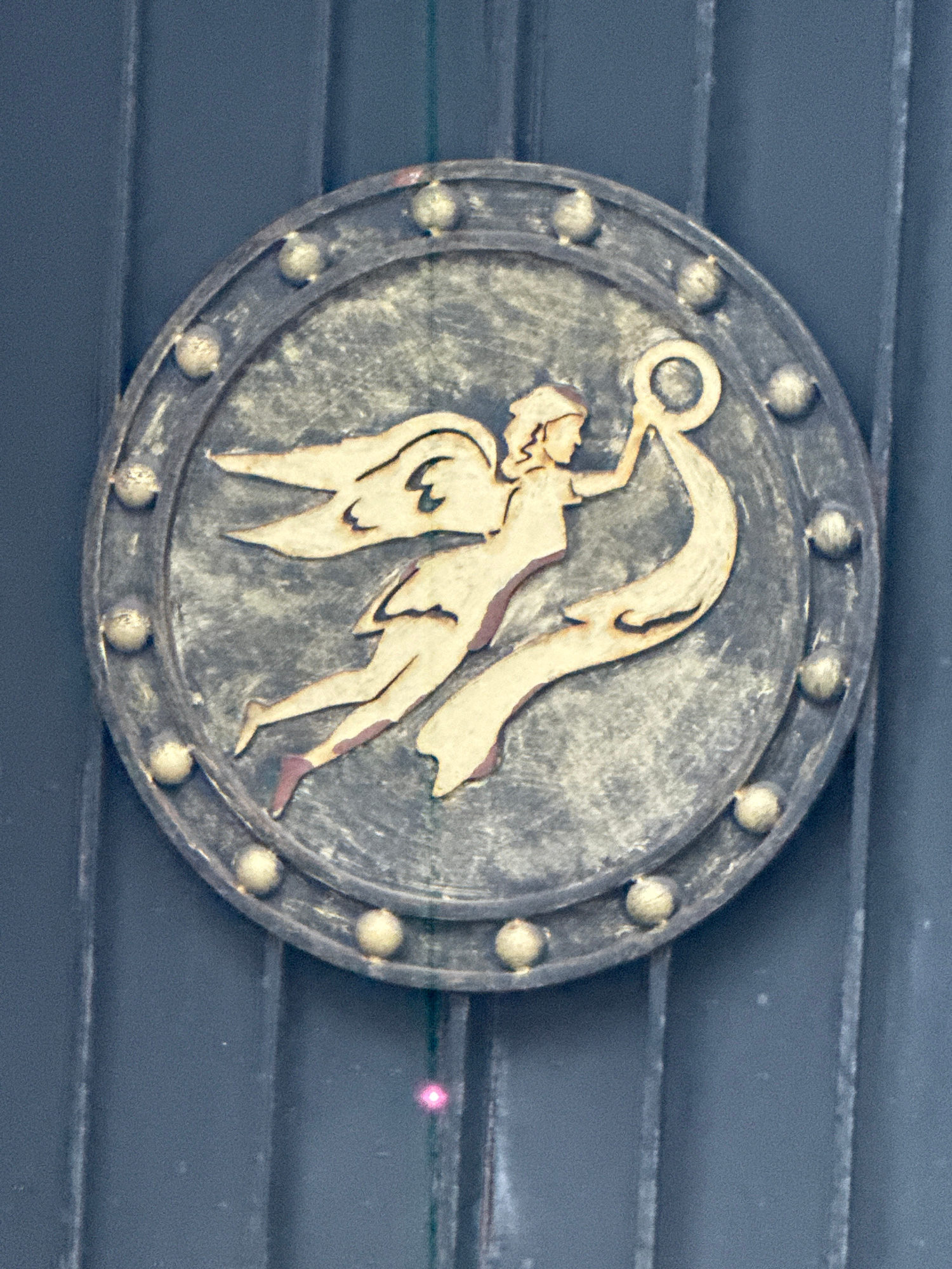 A circular, antique-styled medallion is centered against a dark, horizontally grooved background, likely wood or a similar architectural surface. The medallion appears to be crafted from dark gray, we…read more
