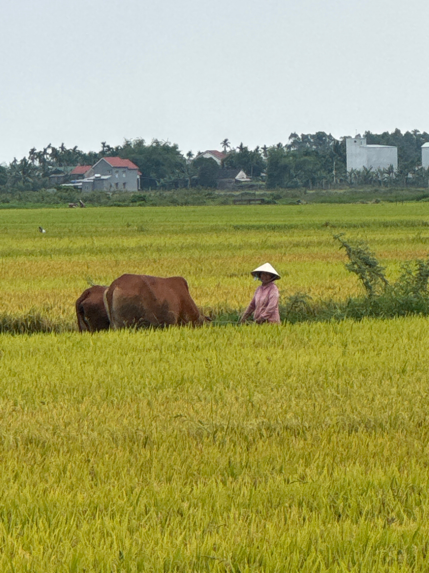 The image captures a rural scene in what appears to be a large rice field in Đà Nẵng, Vietnam. The main subjects are a person and a cow, both situated within the expansive field. The person is visibl…read more