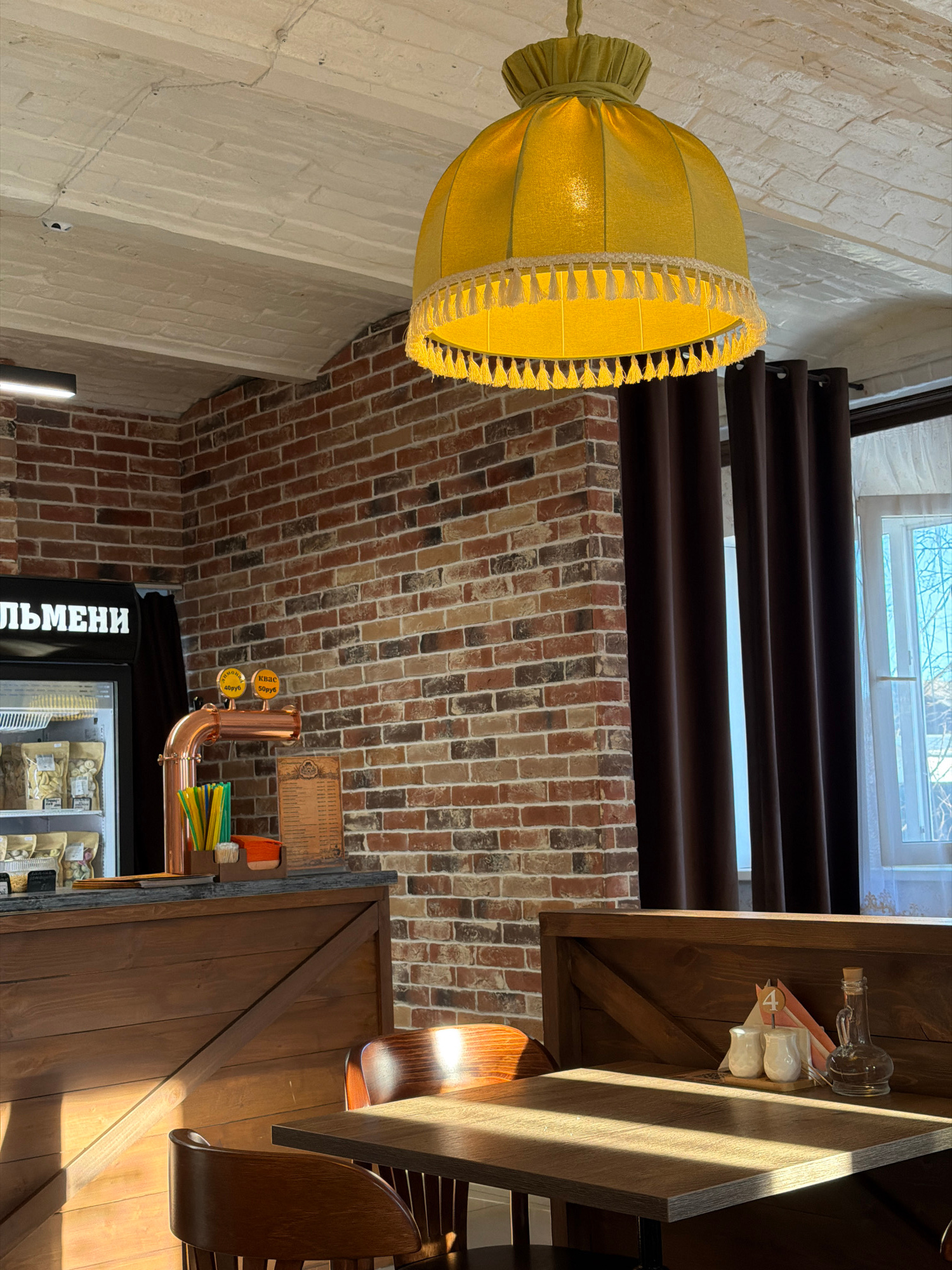 Here's a description of the image: The image shows an interior scene, possibly of a restaurant or cafe, with a rustic aesthetic. **Environment:** The space features a mix of brick and painted white…read more