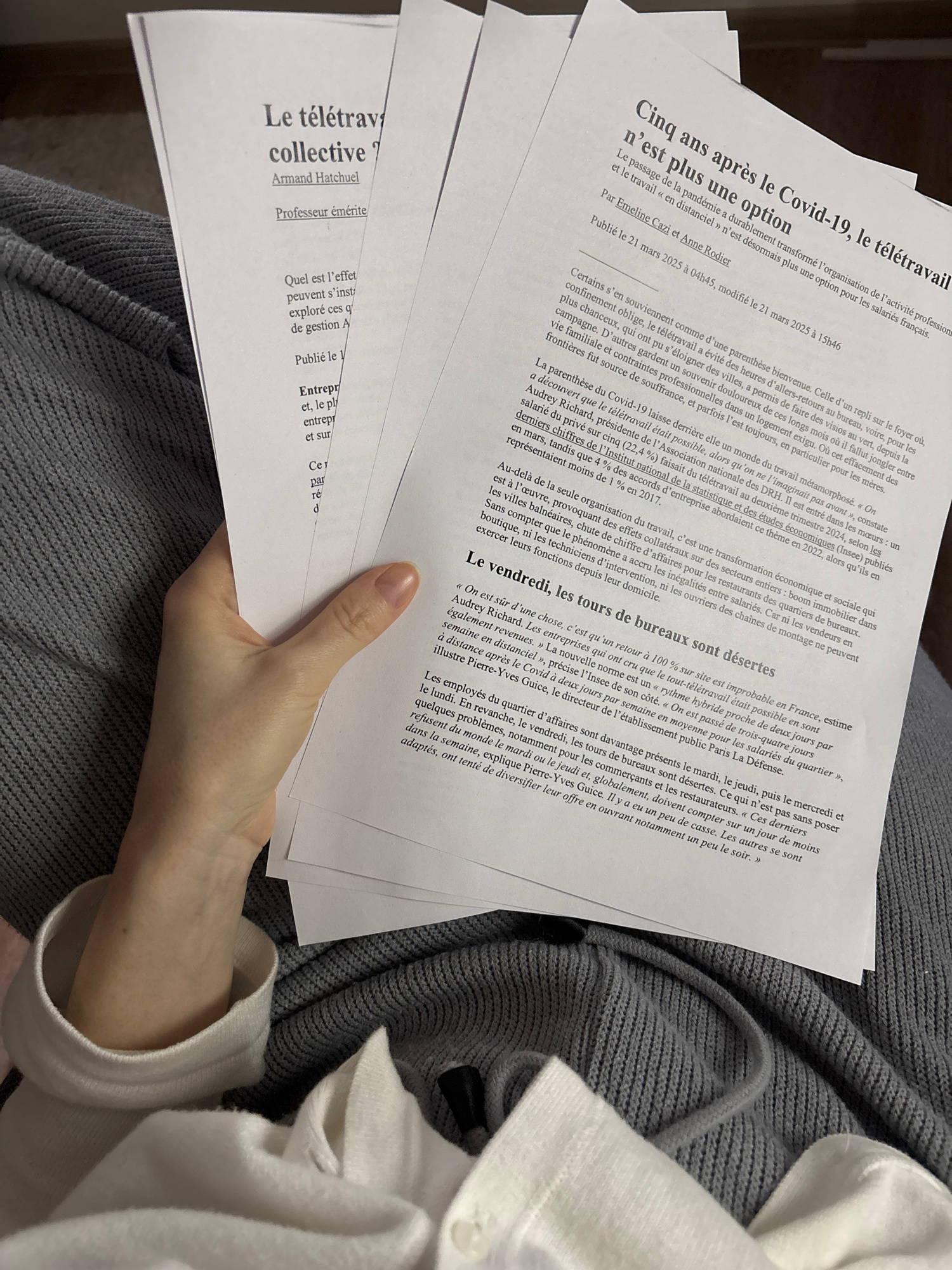 A light-skinned human hand holds several sheets of white paper displaying French text. The papers are held over a textured gray knitted fabric, which features a gray drawstring, and a section of white…read more