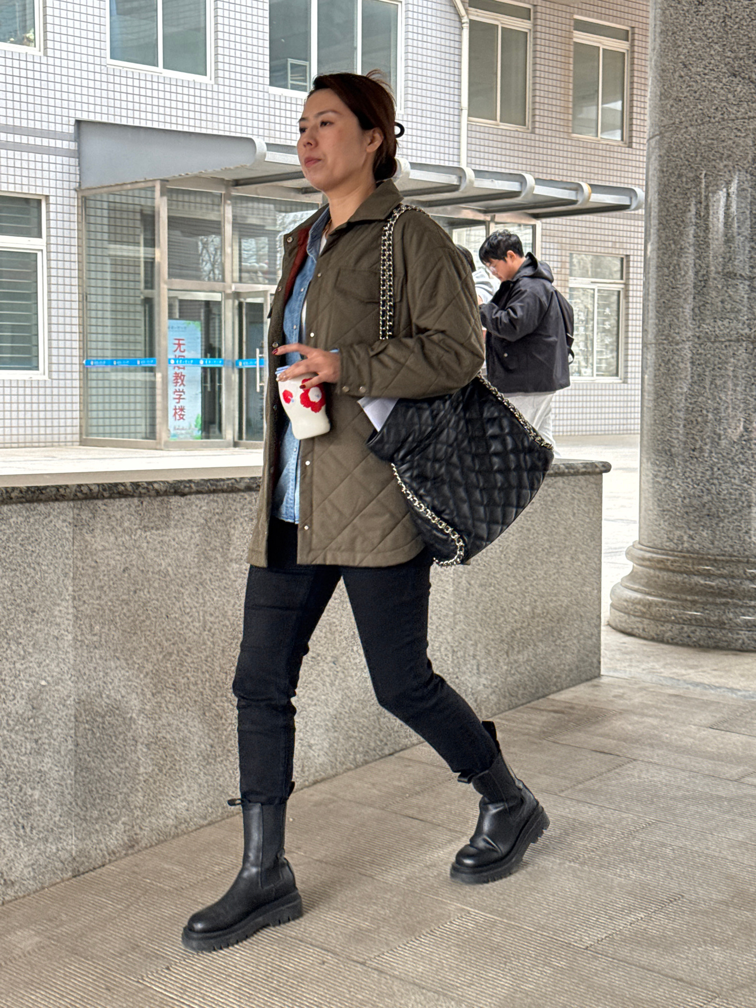 A medium shot presents a woman walking near a building in Zhongtun, China. The woman wears black jeans, black boots, and an olive jacket. She carries a black purse and a white object with red accents…read more