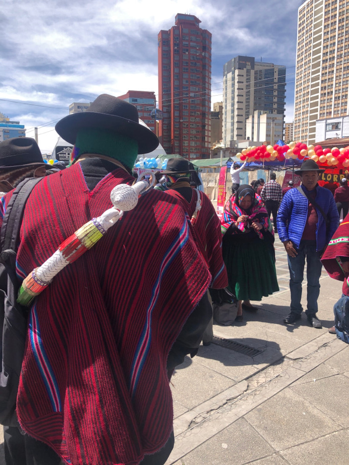 The image depicts an outdoor urban scene on a bright, sunny day, identified as El Prado avenue in La Paz, Bolivia. The foreground is dominated by the back of an individual wearing a dark-brimmed hat,…read more