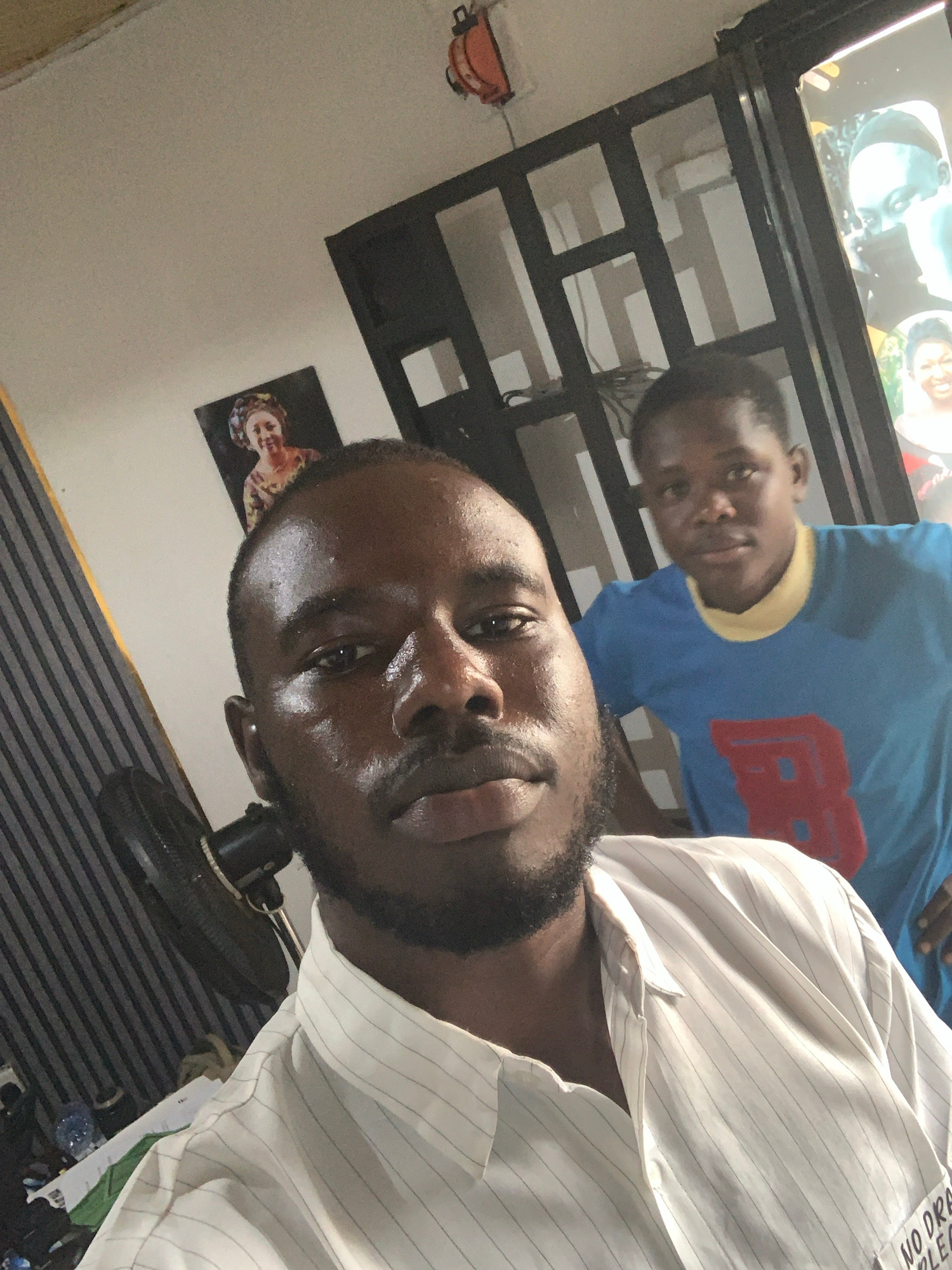 The image shows two people in a room. One person is wearing a white striped shirt. The other person is wearing a blue shirt with a red number. There is a television in the background with people on th…read more
