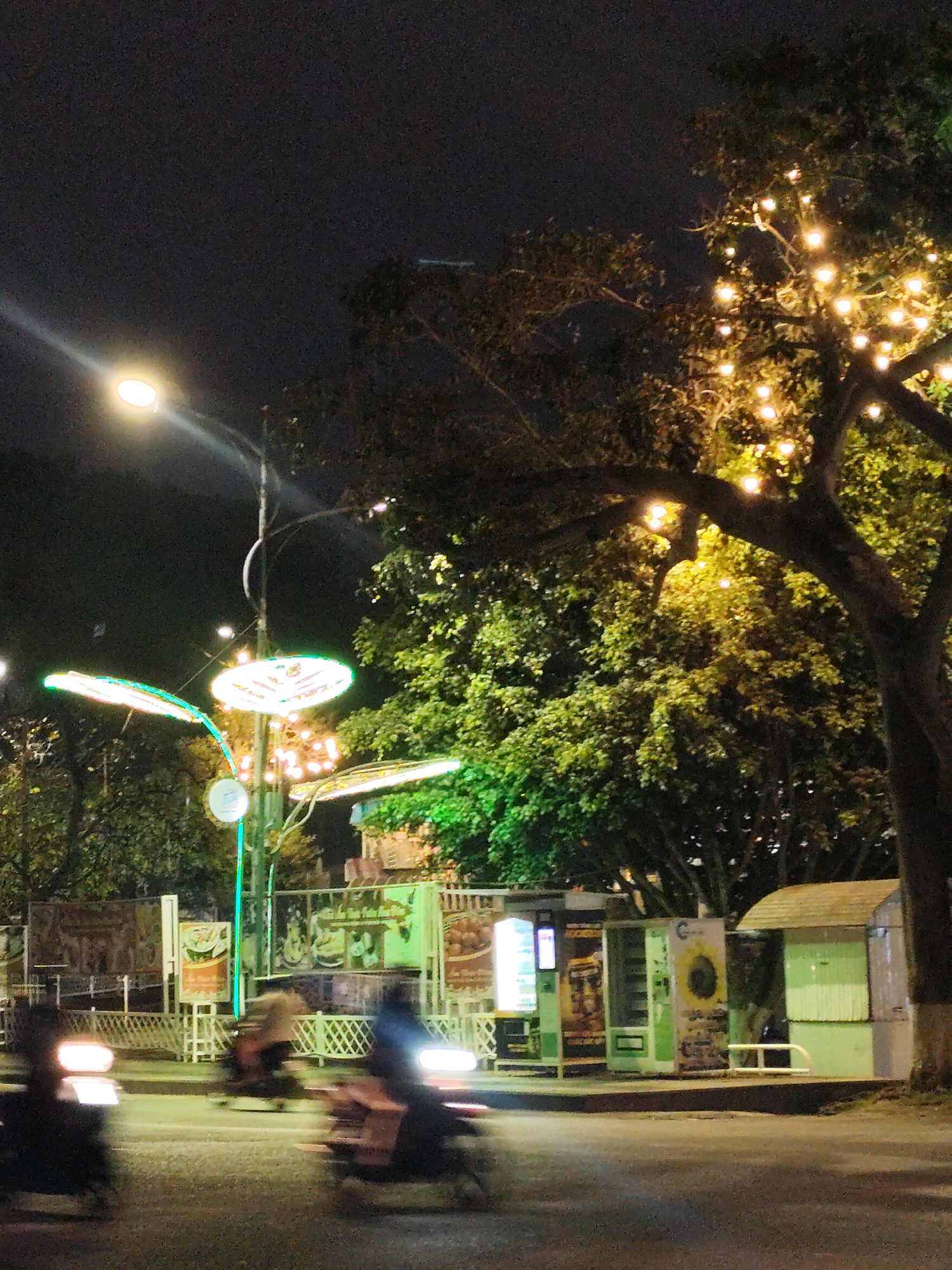 This night scene depicts a lively street in Da Lat, Vietnam, under a dark, clear sky. Artificial lights are the primary source of illumination. A bright streetlight in the upper left casts a strong be…read more