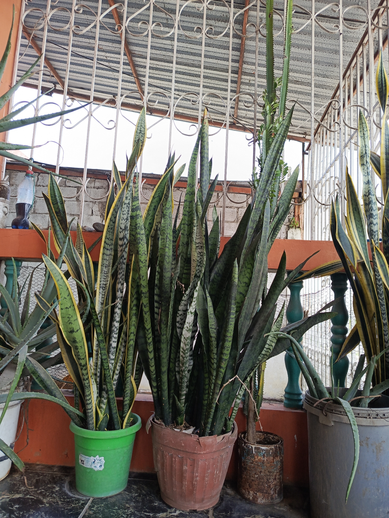 The image depicts a collection of potted plants on a tiled surface, likely a patio or balcony. The location is possibly in the city of Quevedo, Ecuador. Several varieties of plants are present, includ…read more