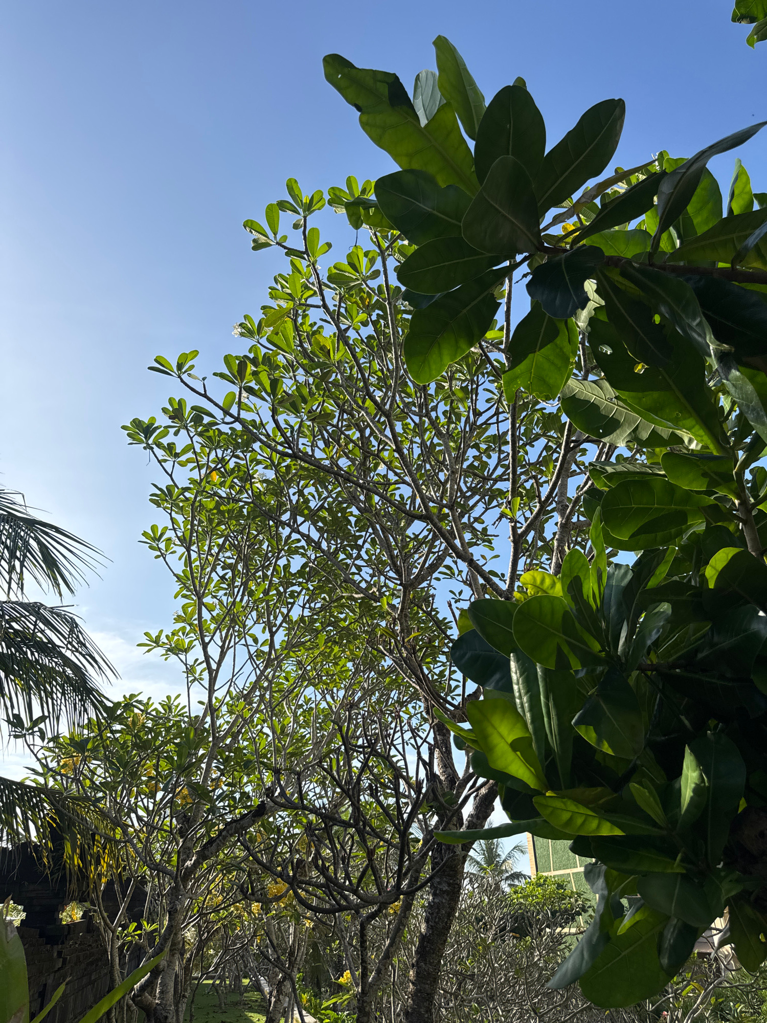 Captured from a low angle in an outdoor setting in Unknown, Indonesia, the image features a view looking upwards through dense foliage against a clear blue sky. Prominent are the large, broad leaves o…read more