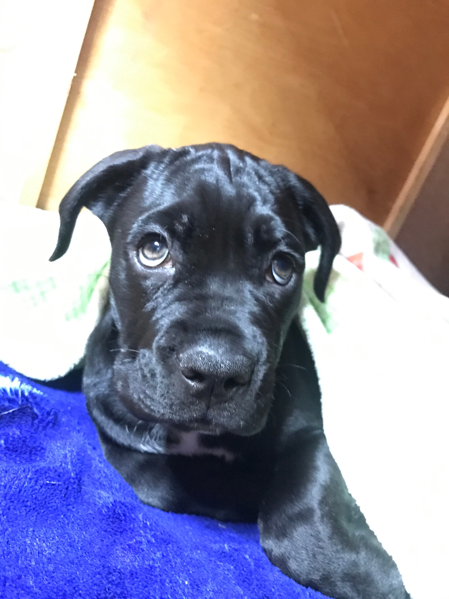 A close-up shot captures a black puppy with a short, smooth coat lying on a bed. The puppy's head is tilted slightly, with both eyes visible and focused directly at the camera. The dog is surrounded b…read more
