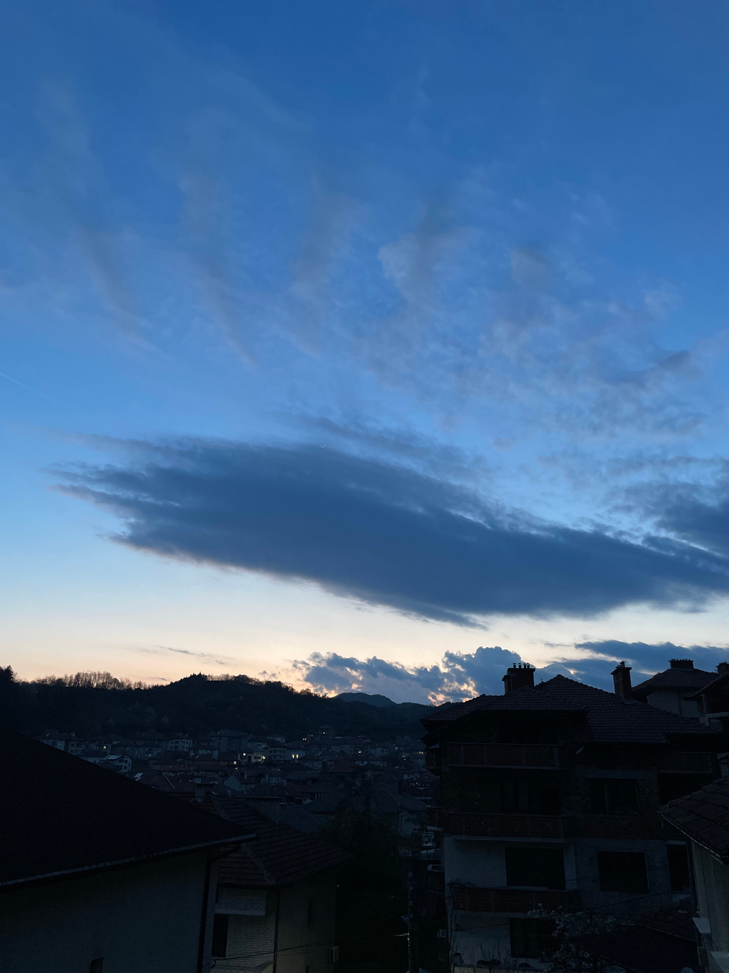 The image depicts an evening cityscape in Zlatograd, Bulgaria, viewed from an elevated position. The sky is predominantly blue with long, dark clouds running diagonally across the frame. In the backgr…read more
