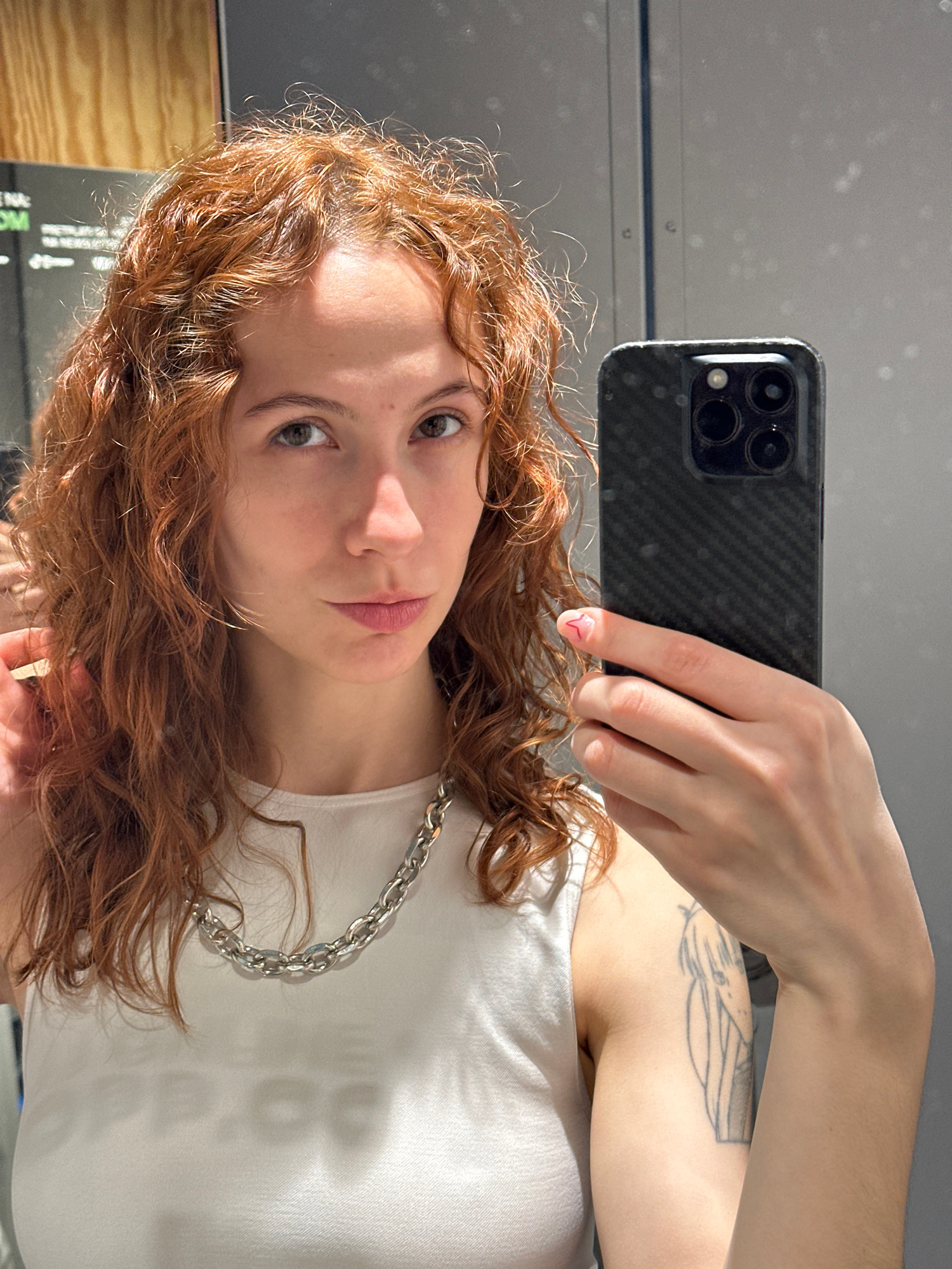 A young woman is taking a selfie in front of a mirror. She has long, wavy, reddish-brown hair and fair skin. She is wearing a white top and a silver chain necklace. She is holding a smartphone with a…read more