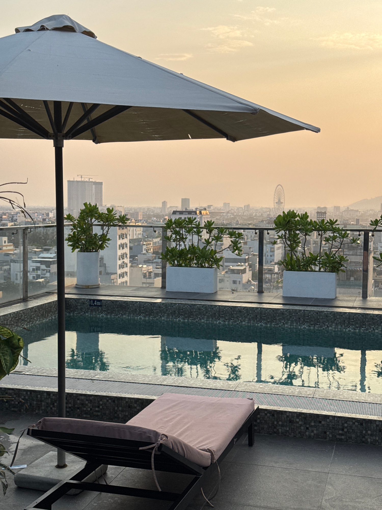 The image captures a rooftop pool scene in Đà Nẵng, Vietnam. An open, large beach umbrella is on the left. A lounge chair sits to the right of the pool. Potted plants line the edge of the pool, separa…read more