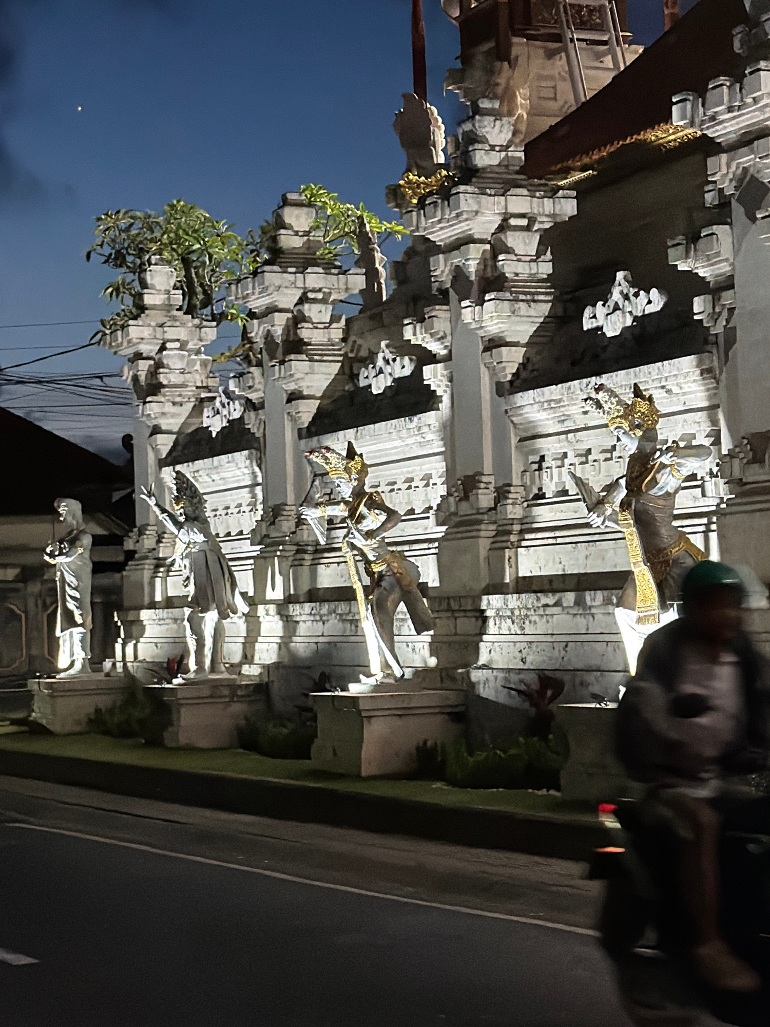 Captured at night in Kutuh, Indonesia, the photograph showcases a Balinese temple gateway. The architectural structure features intricate carvings of deities, statues, and traditional Balinese motifs.…read more