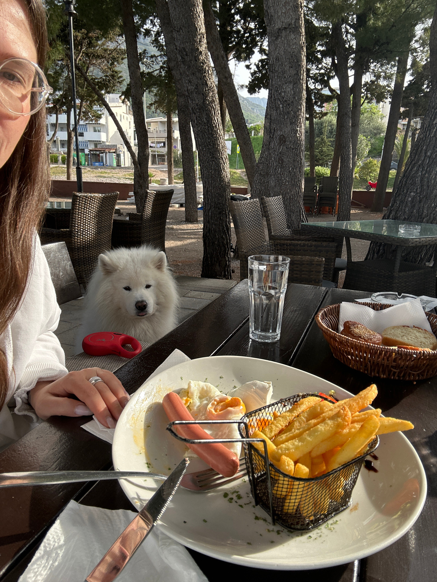 The image depicts a person seated at a table in an outdoor restaurant, likely in the city of Bar, Montenegro, as indicated by the backdrop of coastal buildings and trees. The table holds a plate of fo…read more