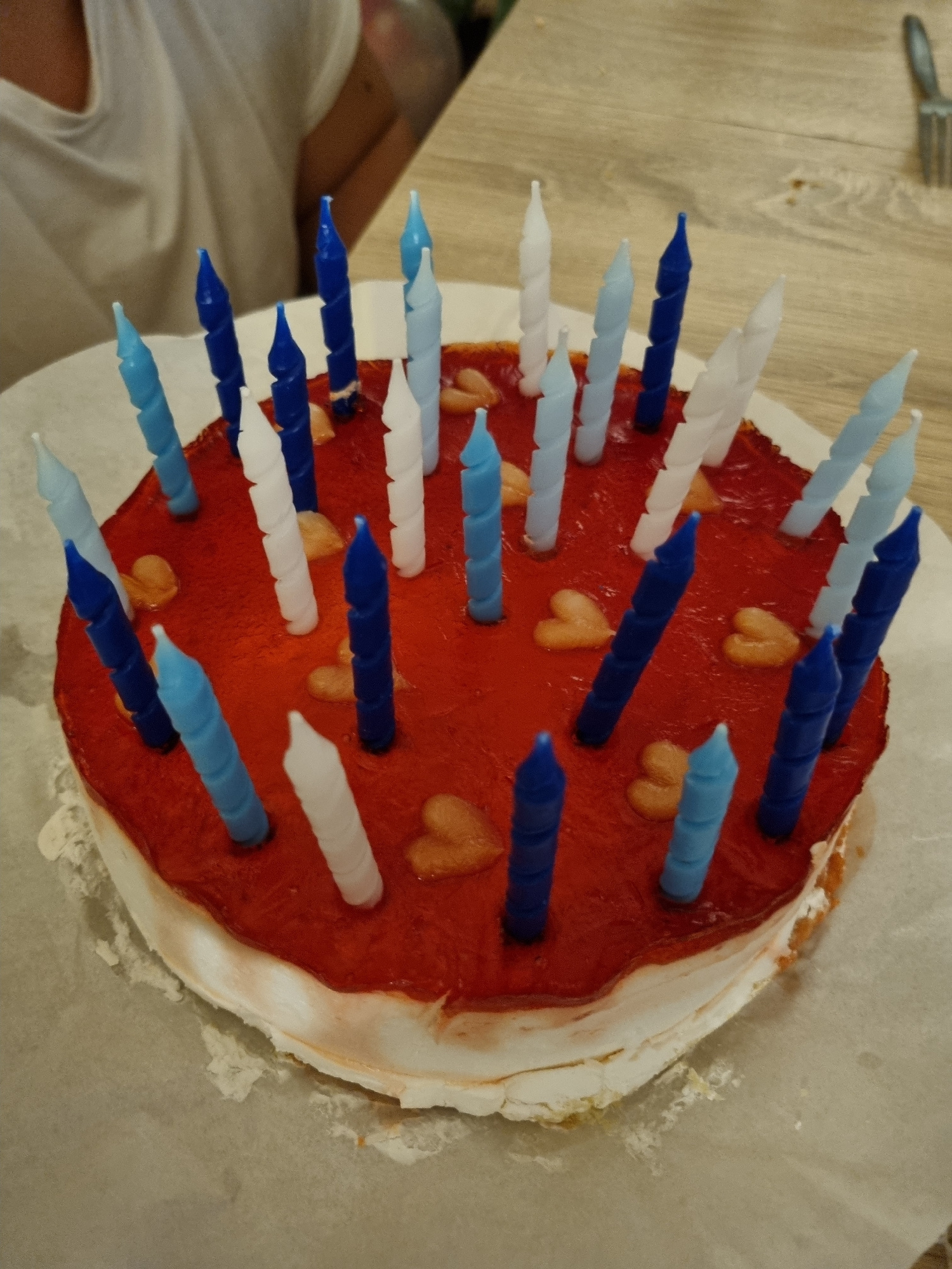 A top-down, slightly angled shot shows a birthday cake with numerous candles, placed on a white parchment paper on a wooden-patterned surface. The cake has a red surface adorned with small, heart-shap…read more