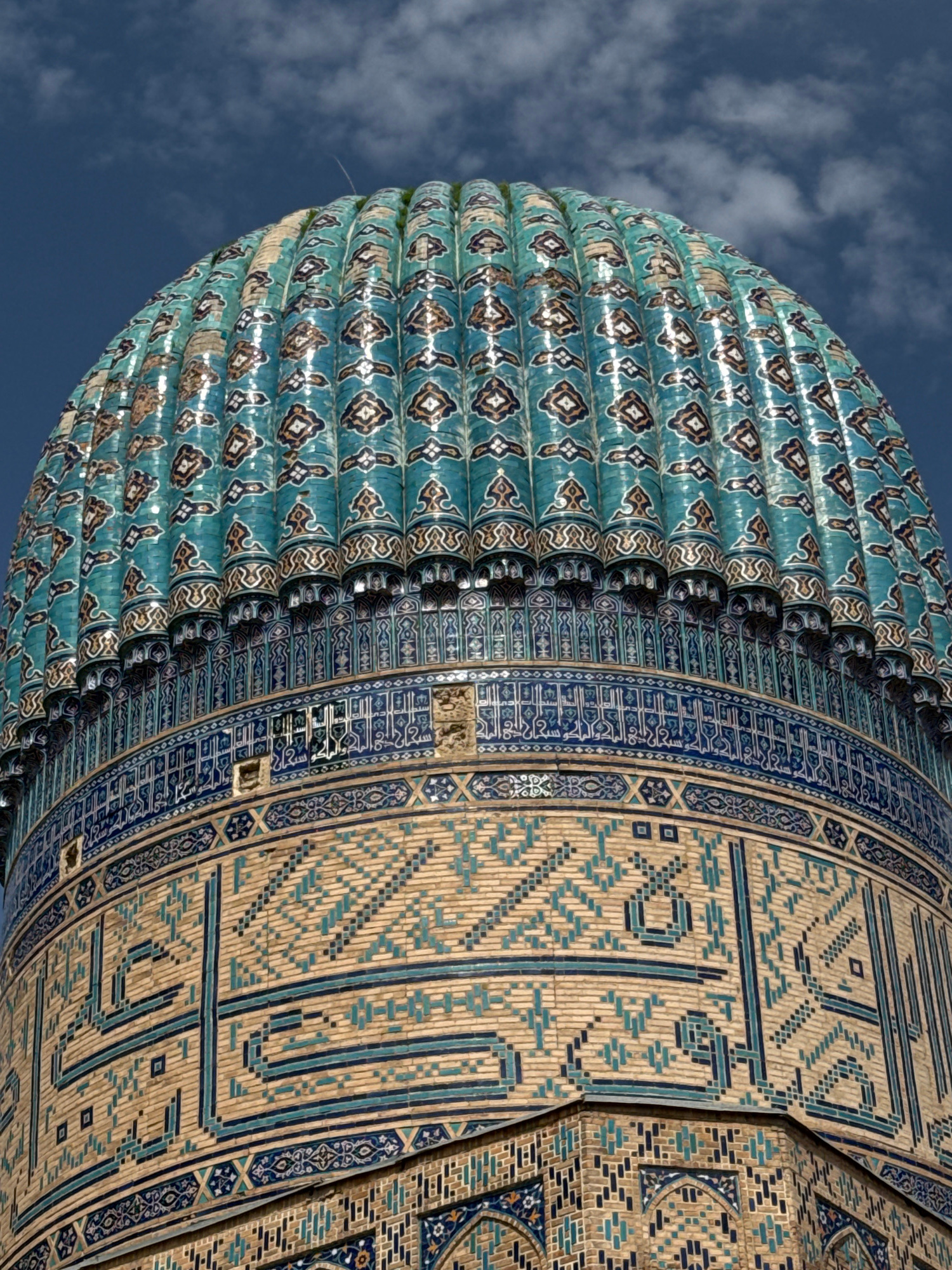 A detailed view looking upward at a segment of the dome and exterior of a building with complex tilework. The architecture is from the city of Samarkand City, Uzbekistan. The dome is ornamented with r…read more