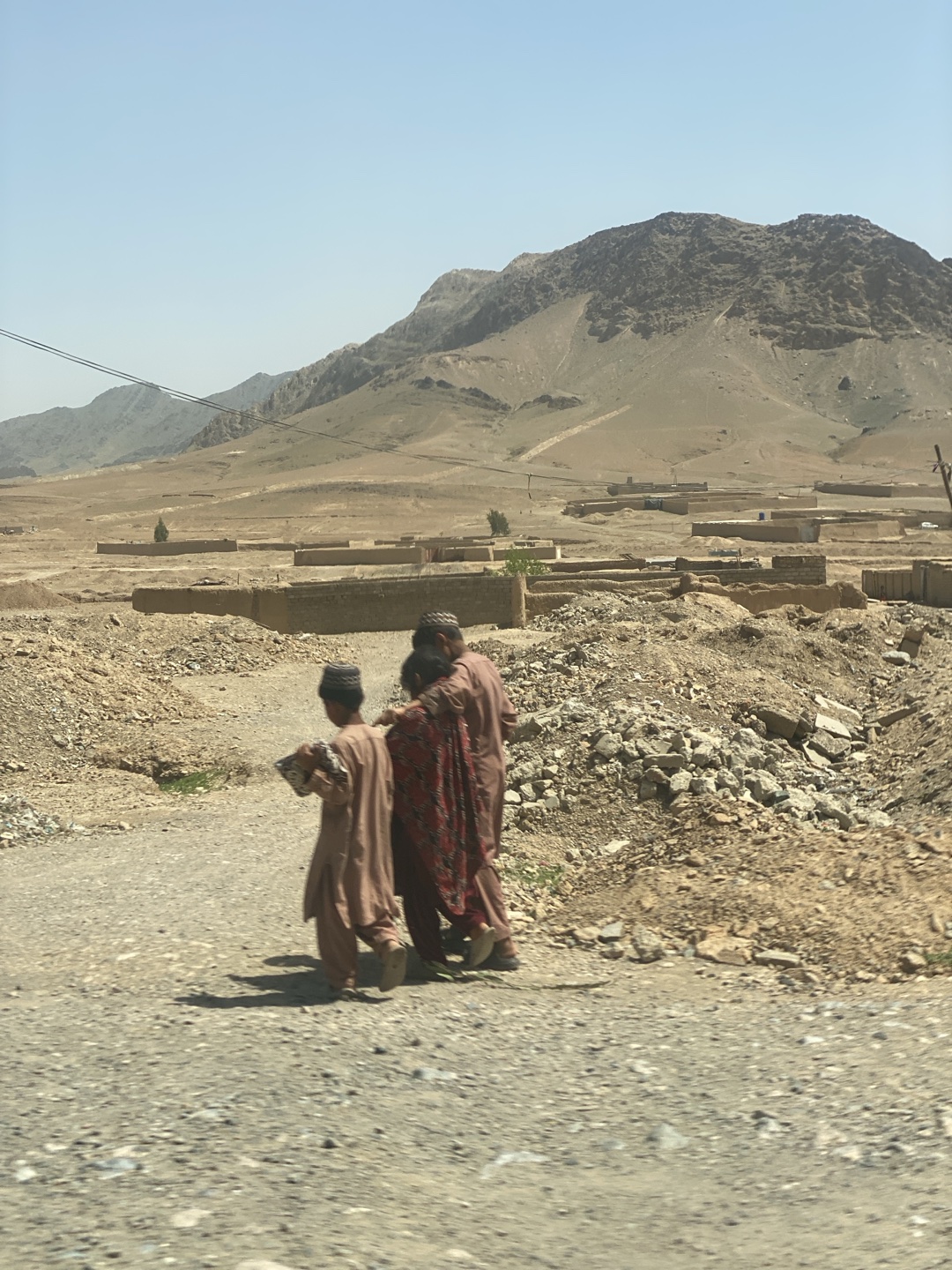 In a desert landscape near Kandahar, Afghanistan, three individuals walk on a dirt road. The person closest to the camera is a child in a cap and loose brown garment, holding an unidentifiable object.…read more