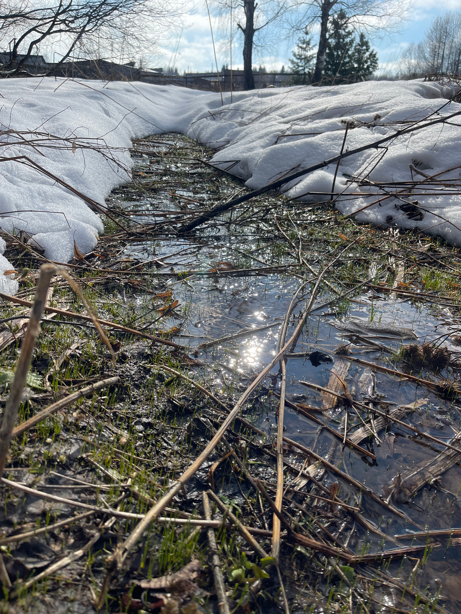 The image shows a muddy, waterlogged area adjacent to a snowbank. There are leafless twigs and some sparse, green vegetation emerging from the water and mud. The sun is reflecting off the surface of t…read more