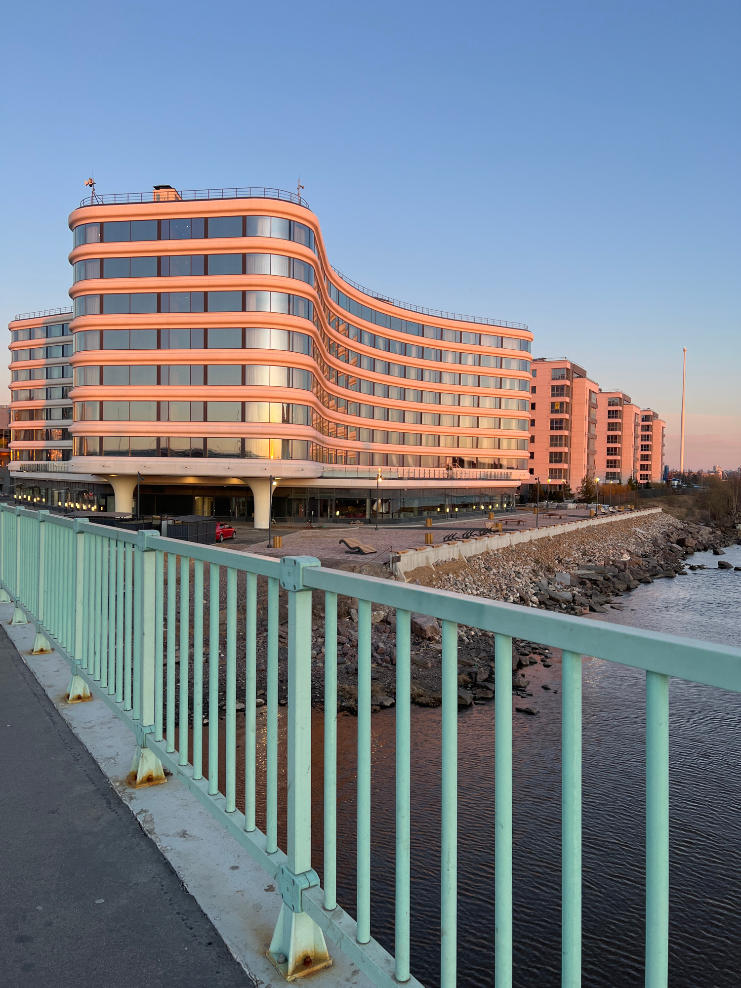 A horizontal medium shot captures a cityscape in Saint Petersburg, Russia, showcasing modern buildings and a river. The scene is bathed in soft, warm light, suggesting either dawn or dusk. The focal p…read more