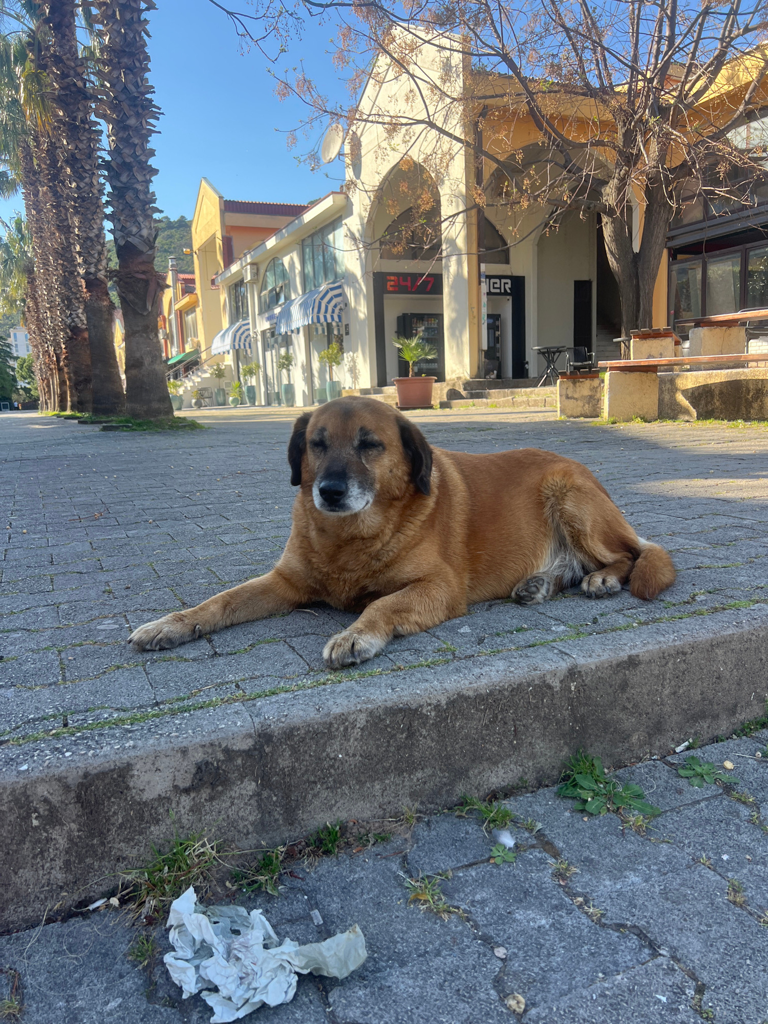 A medium-sized brown dog with dark fur around its face lies on a paved sidewalk next to a curb. The dog is facing the viewer and has its eyes closed. To the right of the dog, there is some crumpled wh…read more