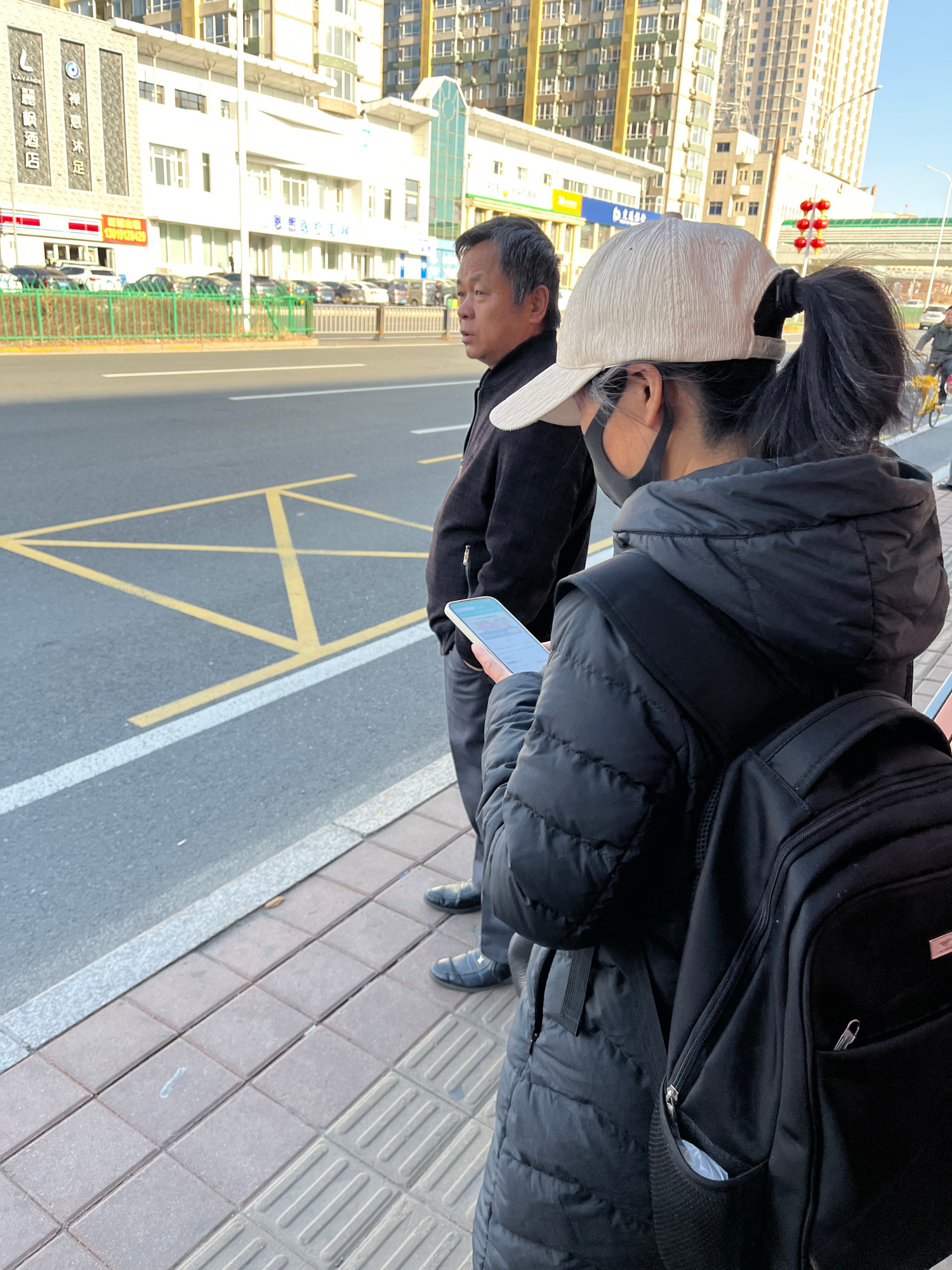 A medium-angle outdoor shot shows two people standing on a sidewalk in what appears to be Changchun City, China. The person closest to the camera is wearing a black puffer jacket and a black backpack.…read more