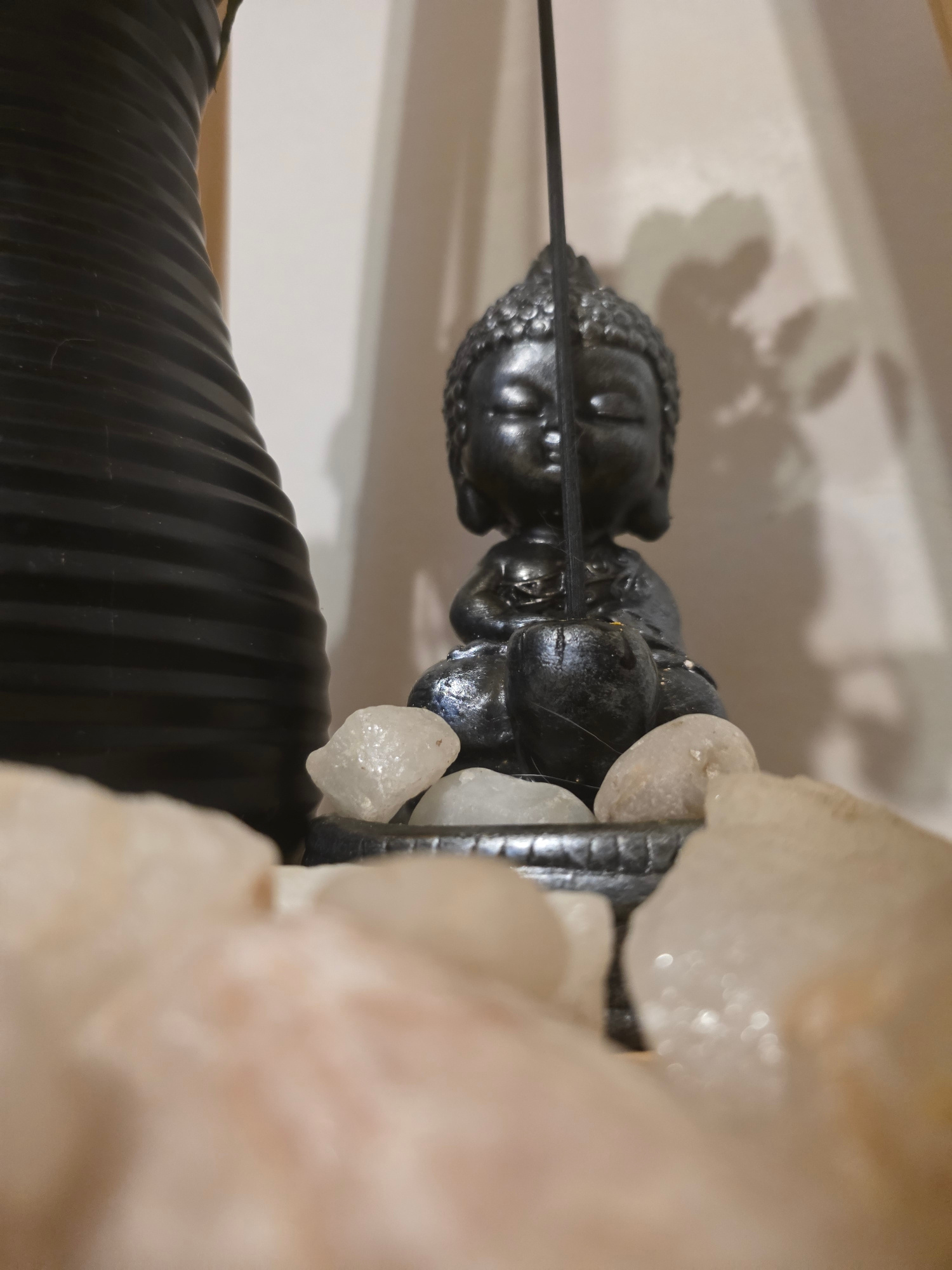 The image displays a close-up, static, indoor arrangement of decorative and spiritual objects. Central to the scene is a small, dark gray or black Buddha figurine, depicted in a seated meditative post…read more