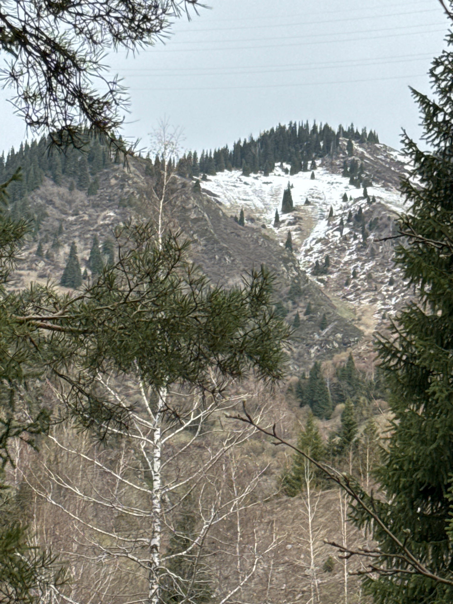 The image displays a rugged, mountainous landscape, likely captured in late winter or early spring. A large mountain slope dominates the background and mid-ground, featuring patches of snow interspers…read more