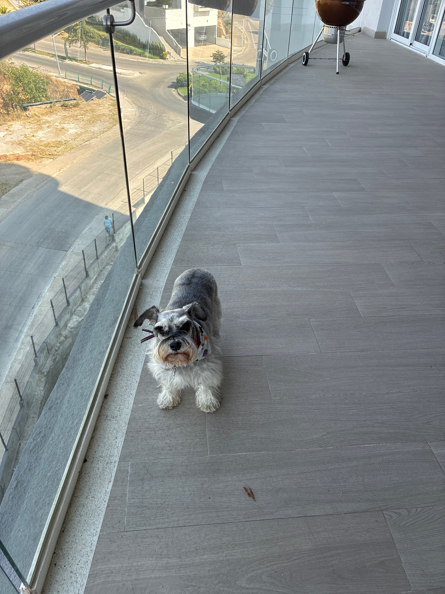 The image, taken from a high-angle perspective, depicts a small, shaggy dog on a modern balcony overlooking a residential area in Huixquilucan de Degollado, Mexico. The dog, possibly a Miniature Schna…read more