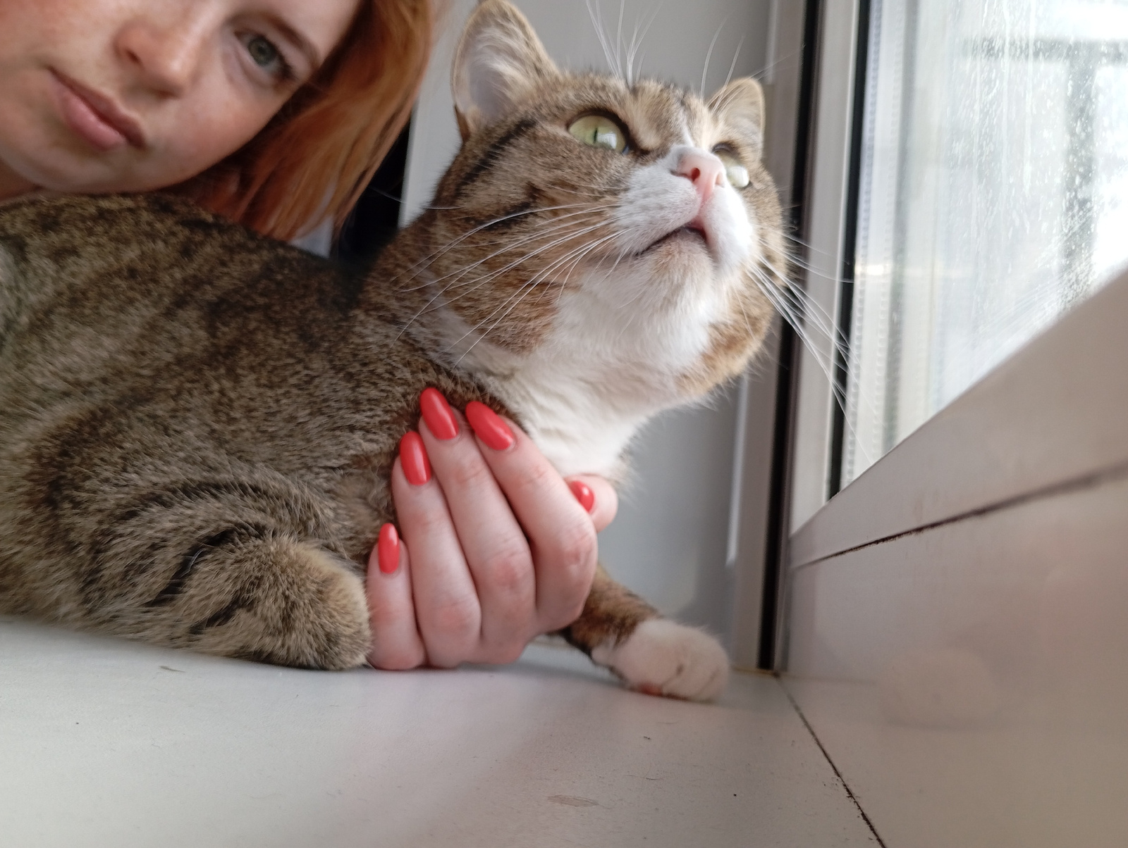 A light brown and white tabby cat with green eyes and long whiskers is positioned near a window, with a woman's hand resting on its back. The woman's fingernails are painted red. The cat is lying near…read more