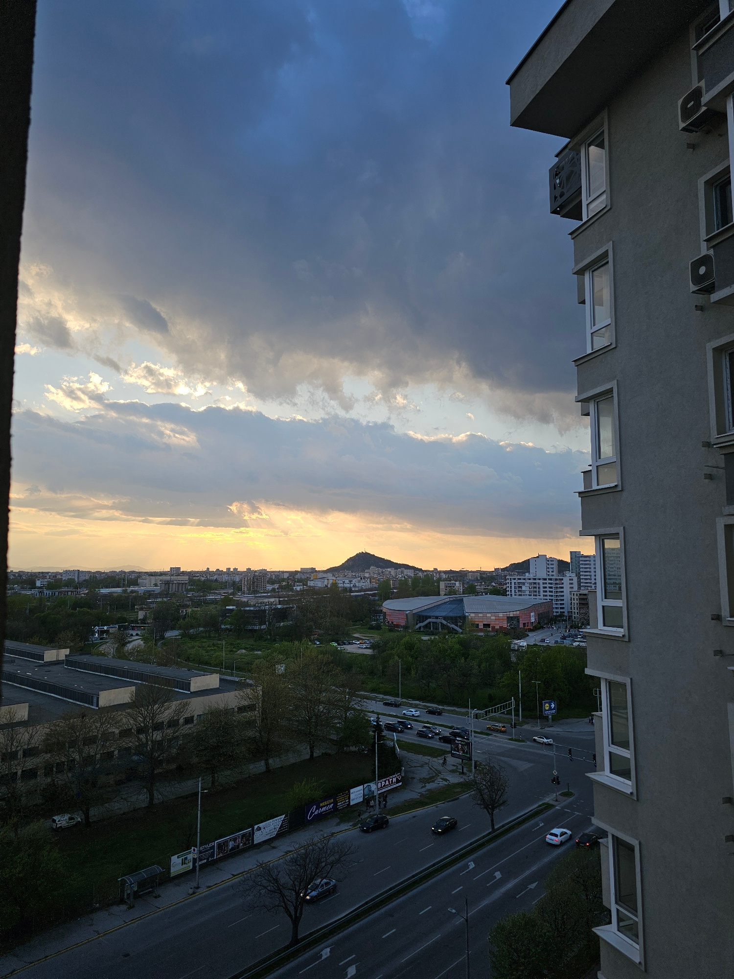 The image displays an urban landscape, likely Plovdiv, Bulgaria, captured from a high vantage point, possibly a window or balcony, during late afternoon or early evening. The scene is framed by parts…read more