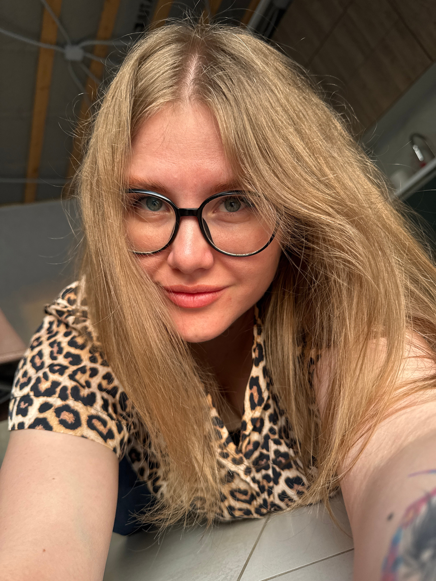 A woman with blonde hair and glasses is posing for a selfie. She is wearing a leopard print top. The location cannot be determined based on the image alone.