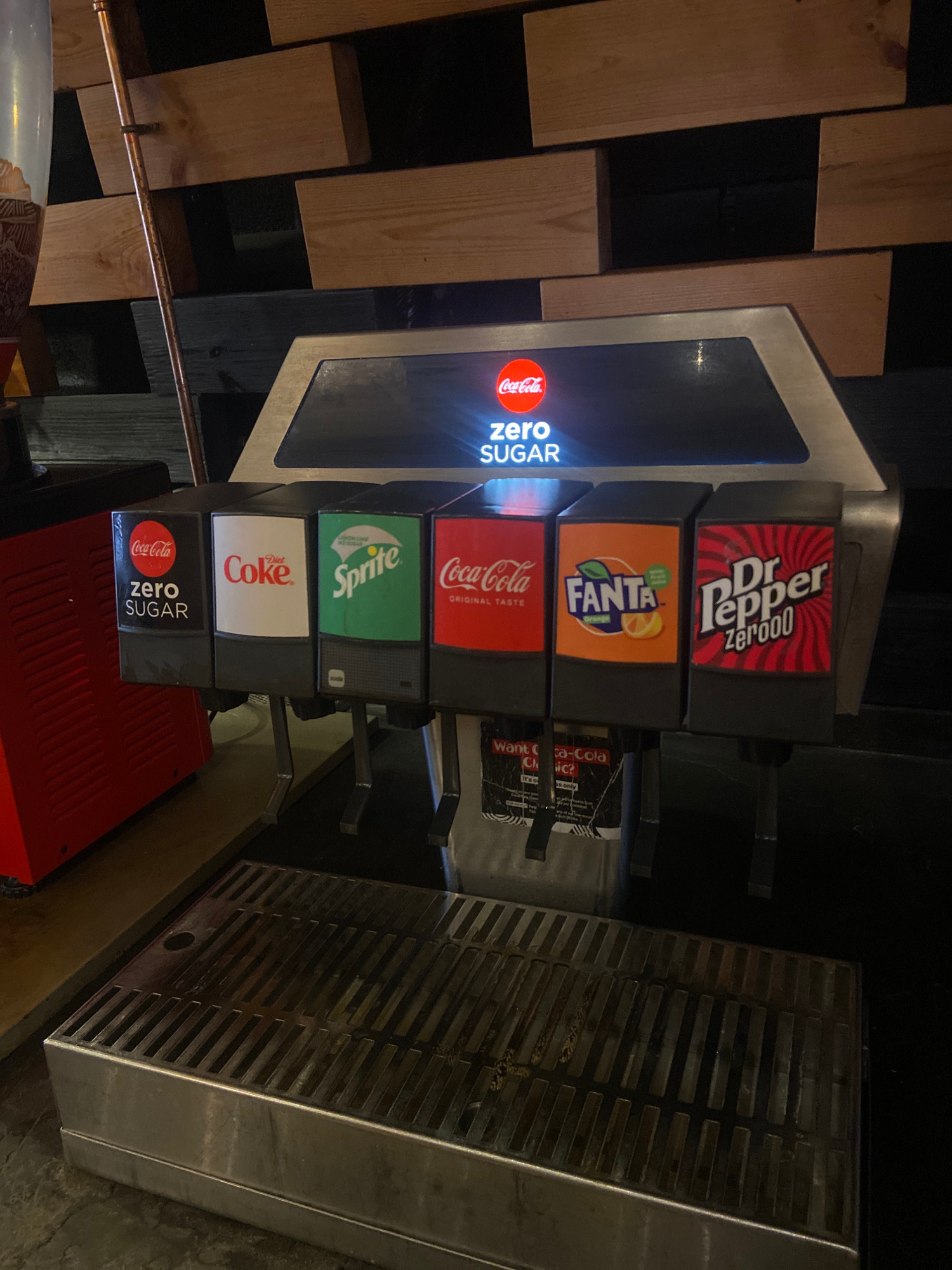The image shows a soda fountain machine with various drink options. The top row displays Dr. Pepper Zero00, followed by Fanta. The middle row features Coca-Cola (original taste), Sprite, and Coca-Cola…read more