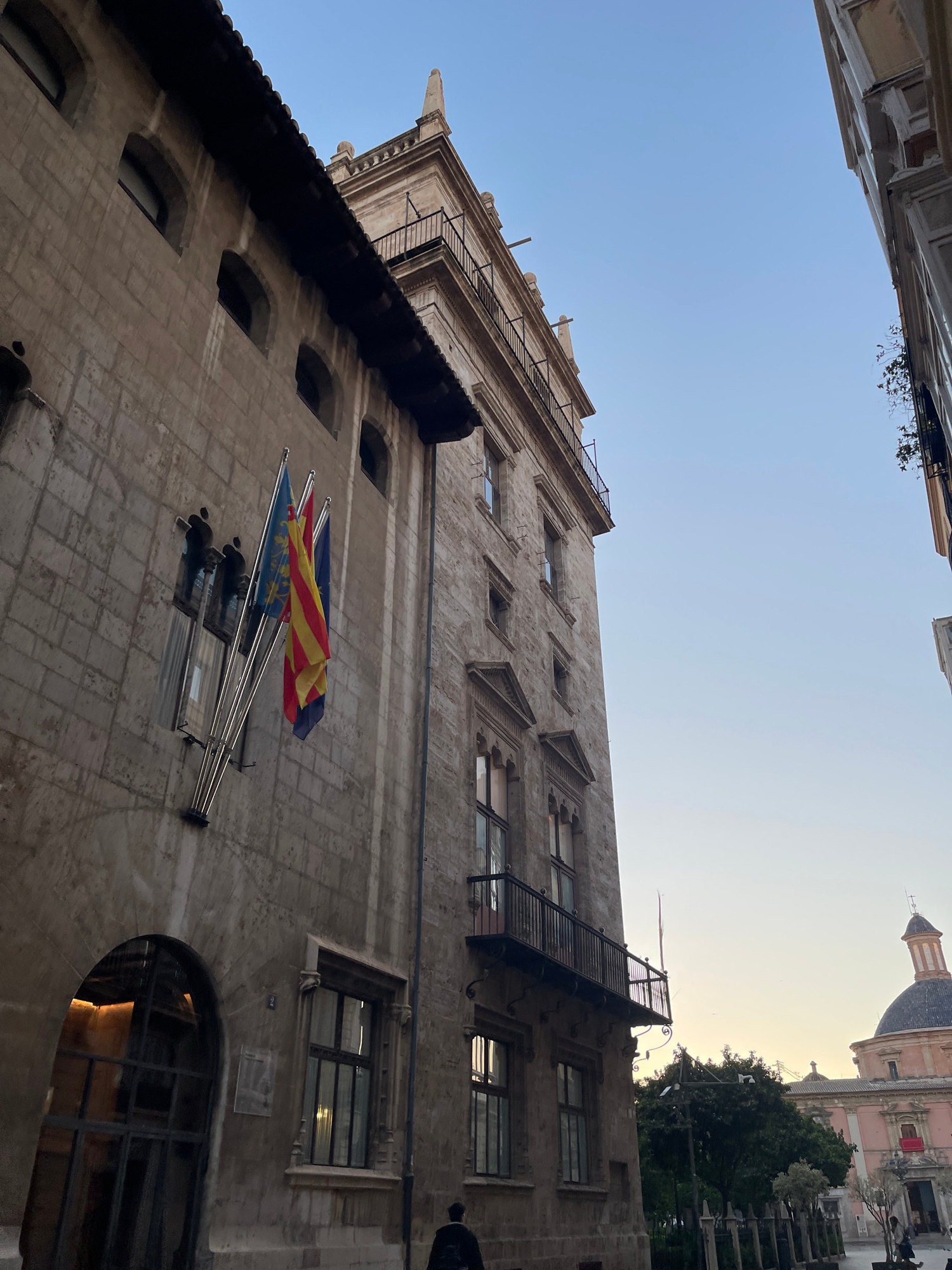 The image depicts a low-angle view of the Palau de la Generalitat, a Gothic-style palace in Valencia, Spain. The building's façade is prominent, with its stone construction, windows, and the flags of…read more