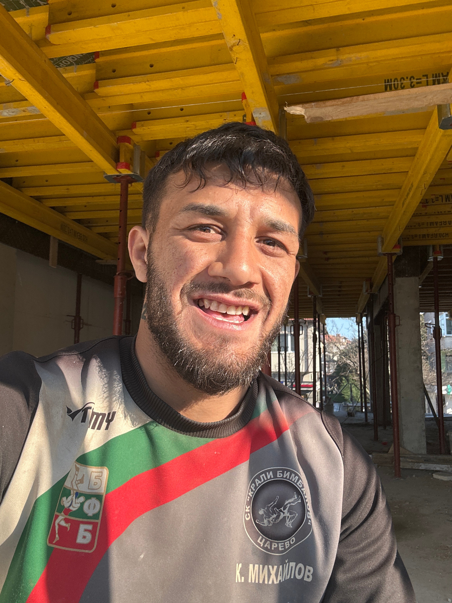 A man with dark hair and a beard is smiling at the camera in an outdoors environment. He is wearing a sweatshirt with a grey body, black sleeves and collar, and stripes in red, green and white, which…read more