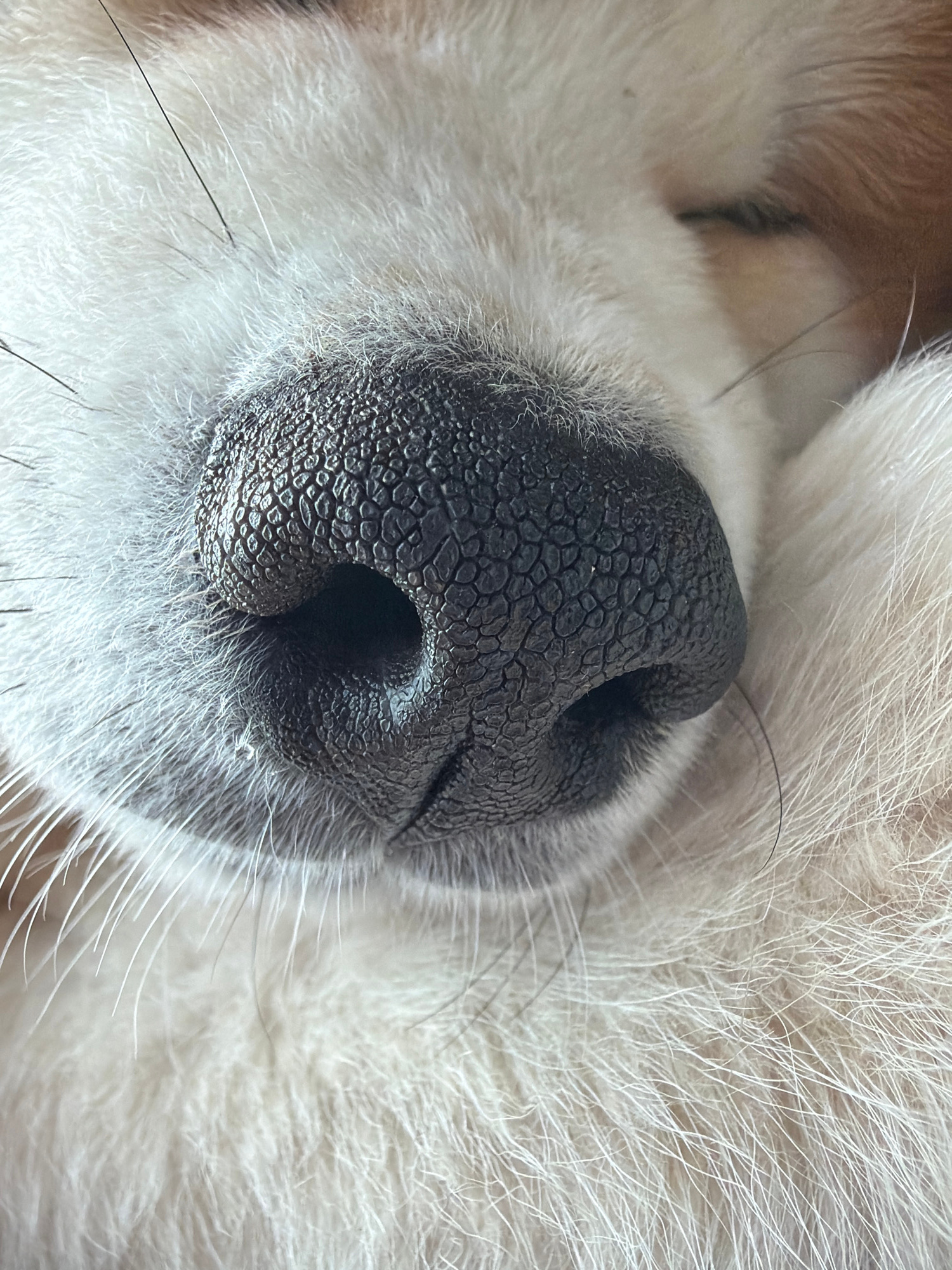 This close-up image features the textured black nose of a dog, surrounded by soft, fluffy white fur. The dog's nose displays a detailed, scale-like pattern and appears moist, with the right nostril cl…read more