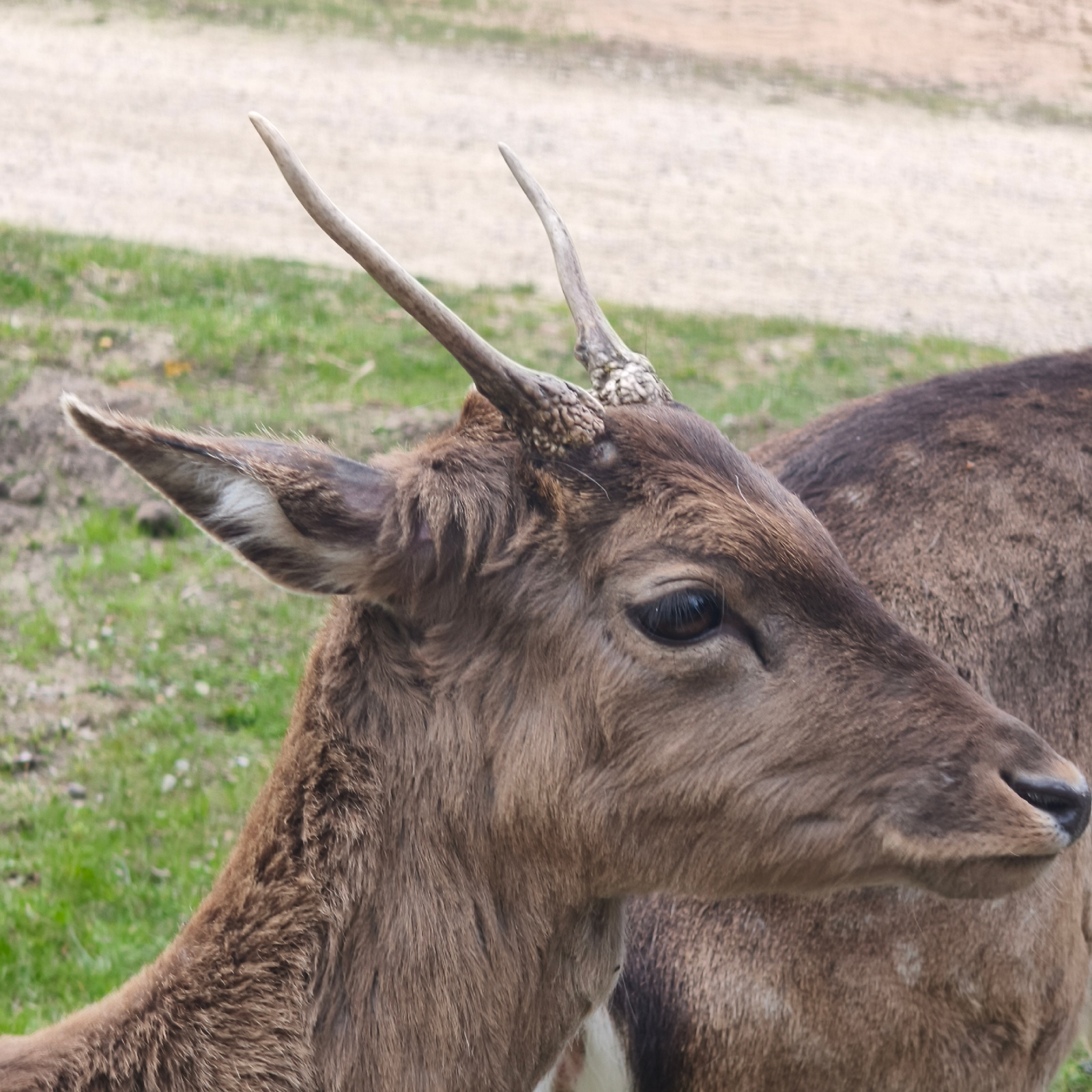 A close-up shot of a deer's head and partial body. The deer has a dark brown coat and small antlers that are just beginning to grow. The background shows grass and dirt. The image appears to be taken…read more