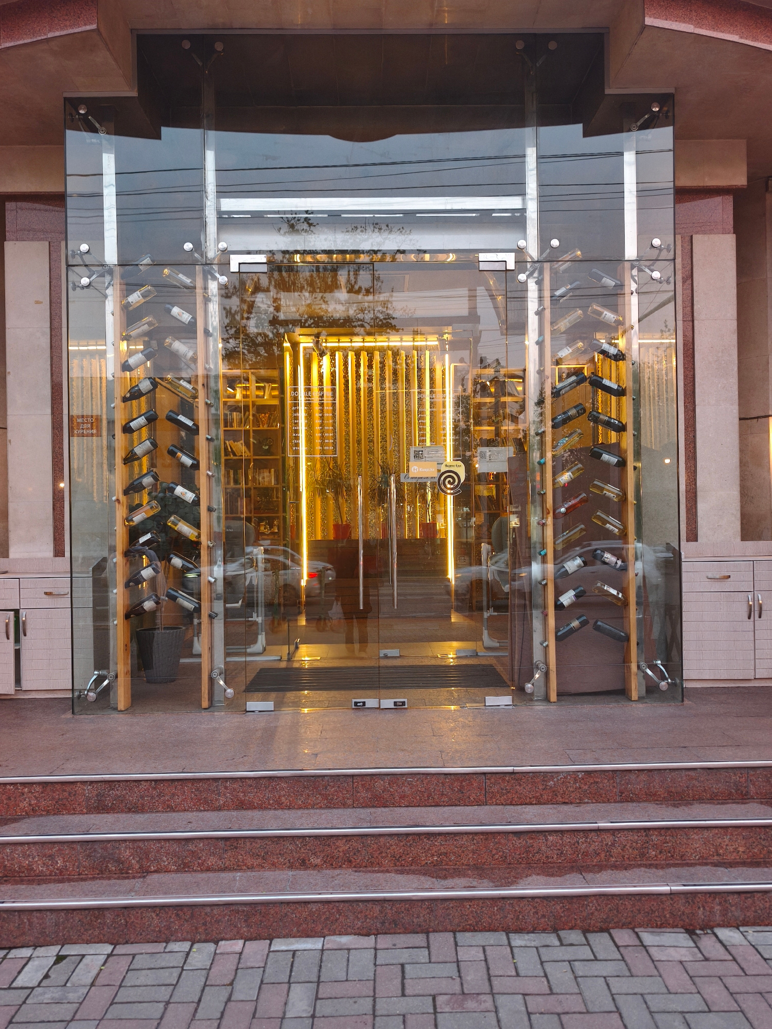 The image shows the entrance to a business, likely a restaurant or café, in Almaty, Kazakhstan. The building has a modern design, with glass doors framed by clear glass panels on either side that hold…read more