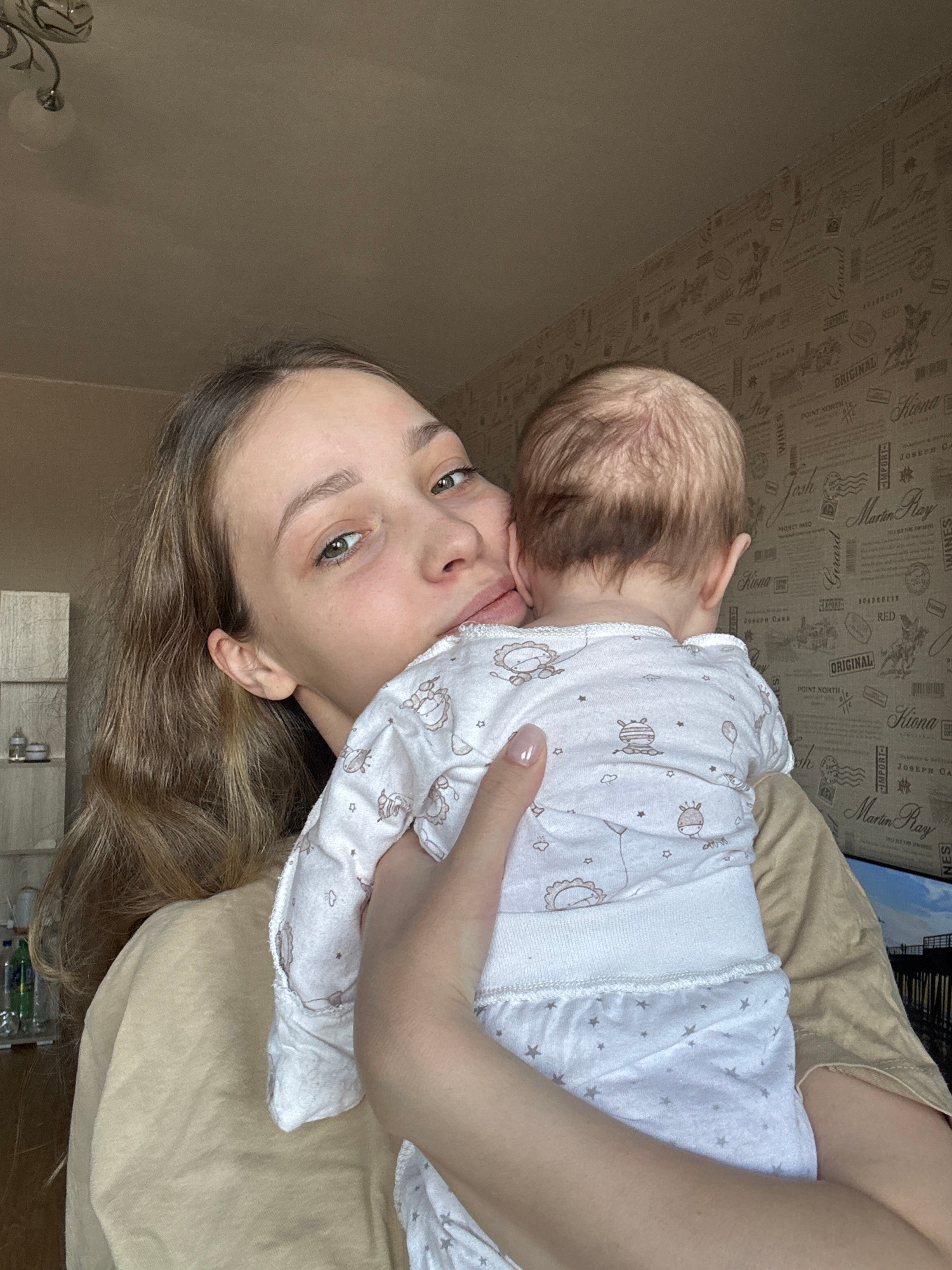 A woman with light skin, light brown hair, and green eyes is holding a baby with a fair complexion and light hair. The woman is looking at the camera with a slight smile. The baby is lying in her arms…read more
