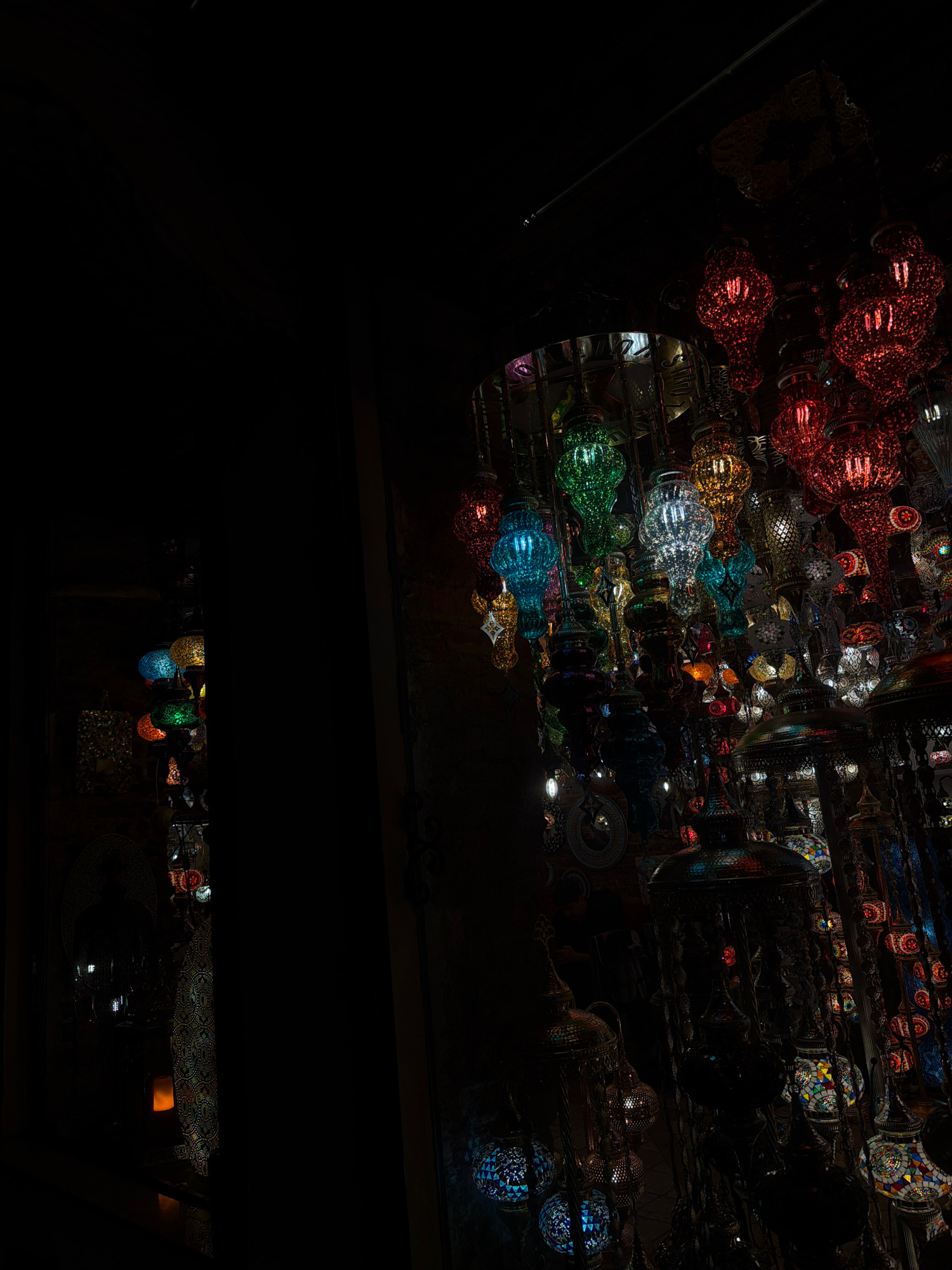 The image captures a dimly lit interior, likely a shop in Beyoğlu, Turkey, displaying a multitude of colorful Turkish lamps hanging from the ceiling. The lamps, varying in color from red to blue to gr…read more