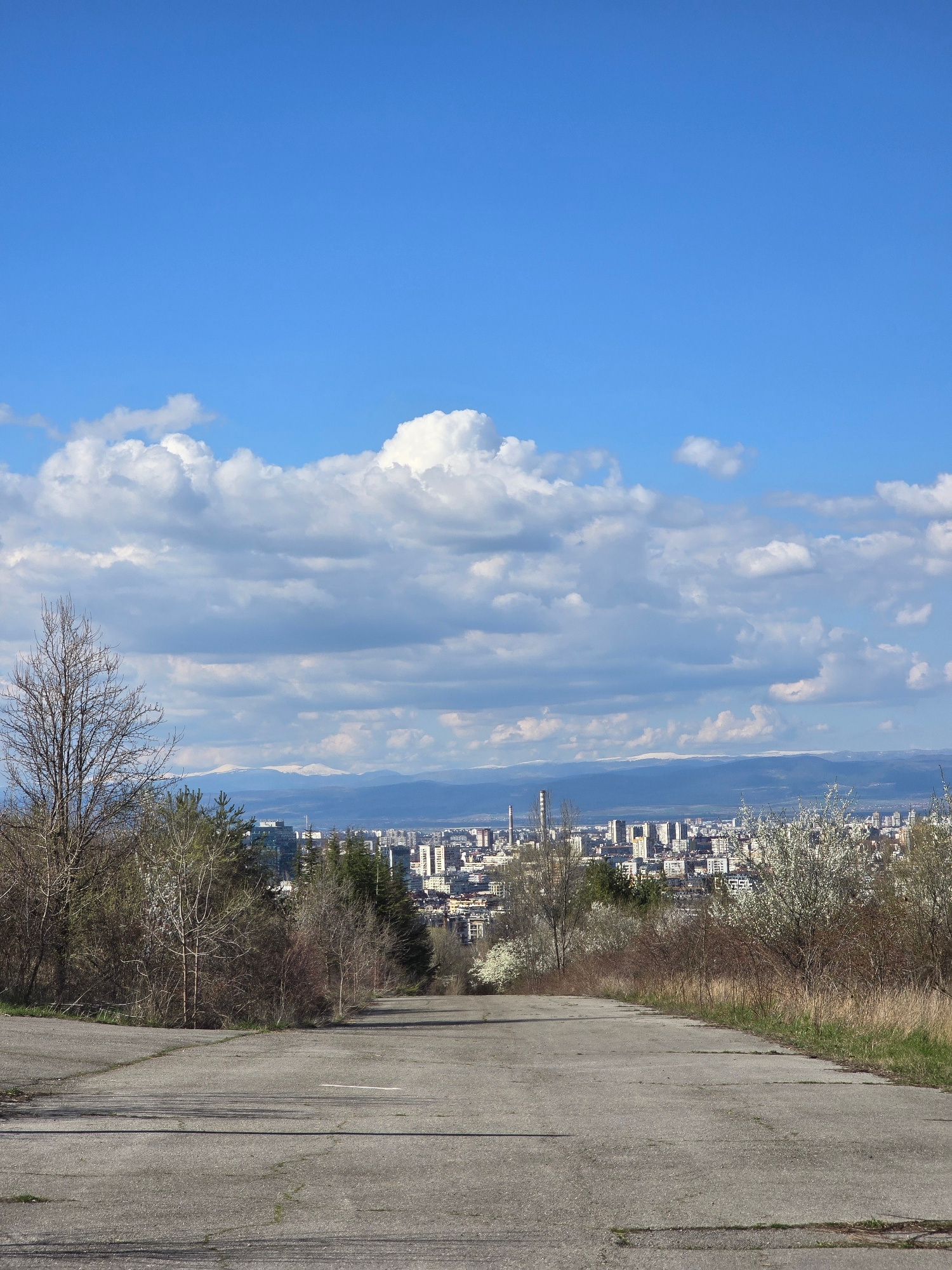 The image shows a view from above of the city of Sofia, Bulgaria on a sunny day with clouds in the sky. A paved road runs along the right side of the frame, with vegetation and trees to its left. Beyo…read more