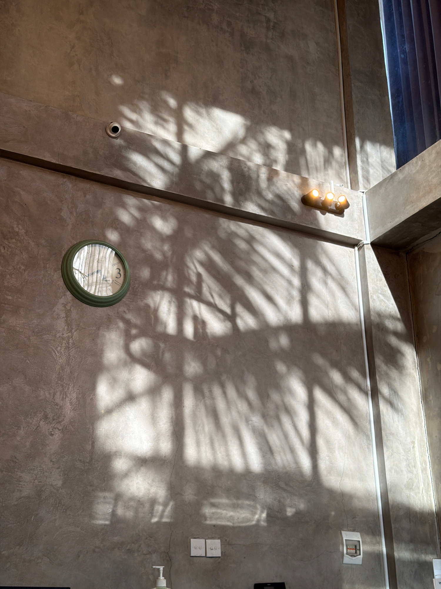 A high-angle shot depicts an interior wall in North Kuta, Indonesia, bathed in sunlight and shadow. The textured grey concrete wall is bisected by a supporting beam. A round, green-framed clock is mou…read more