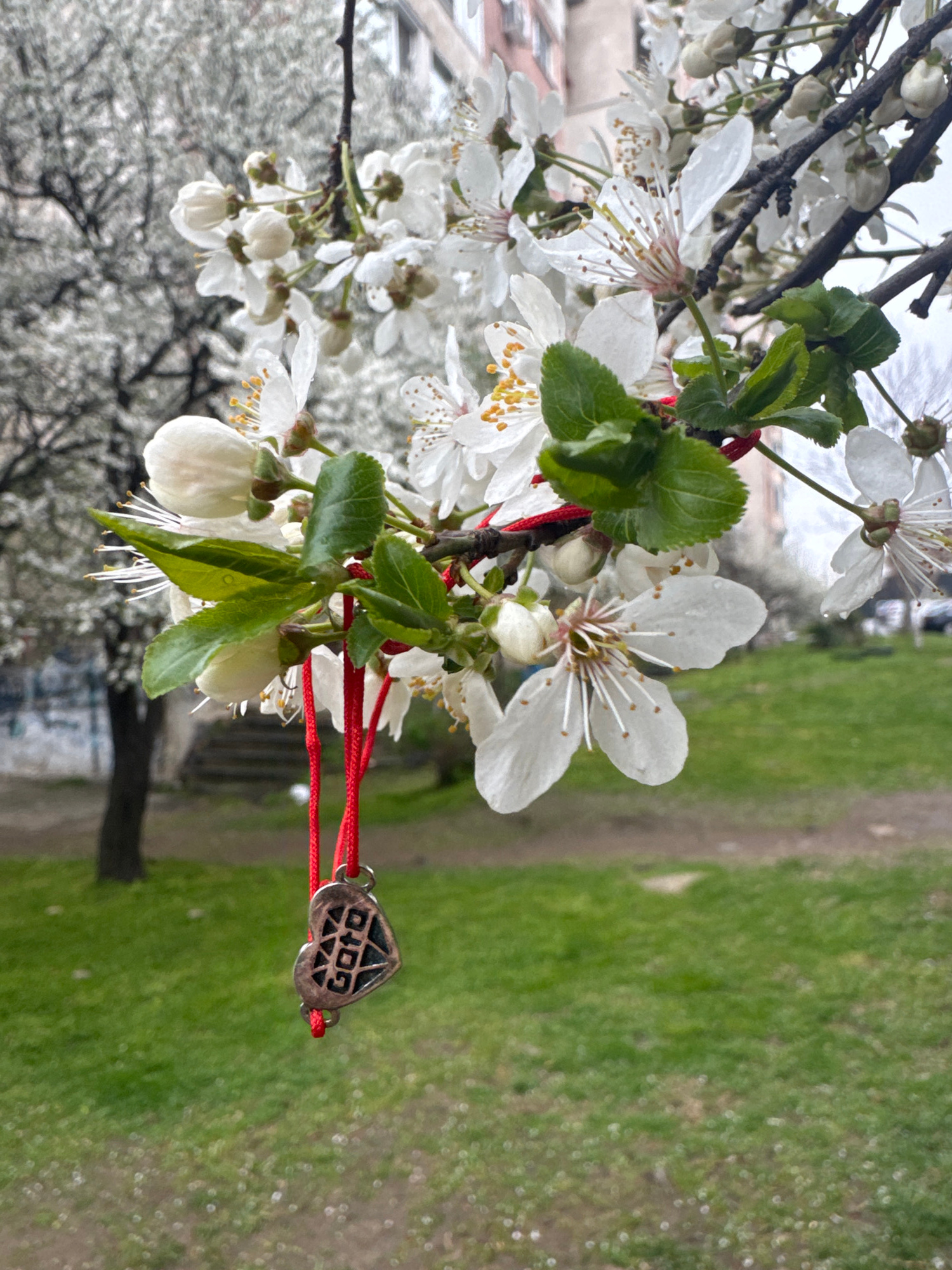 A close-up, rotated image captures a blooming tree branch in what appears to be a park setting. The branch is adorned with white flowers and green leaves. A red string with a heart-shaped metal charm…read more