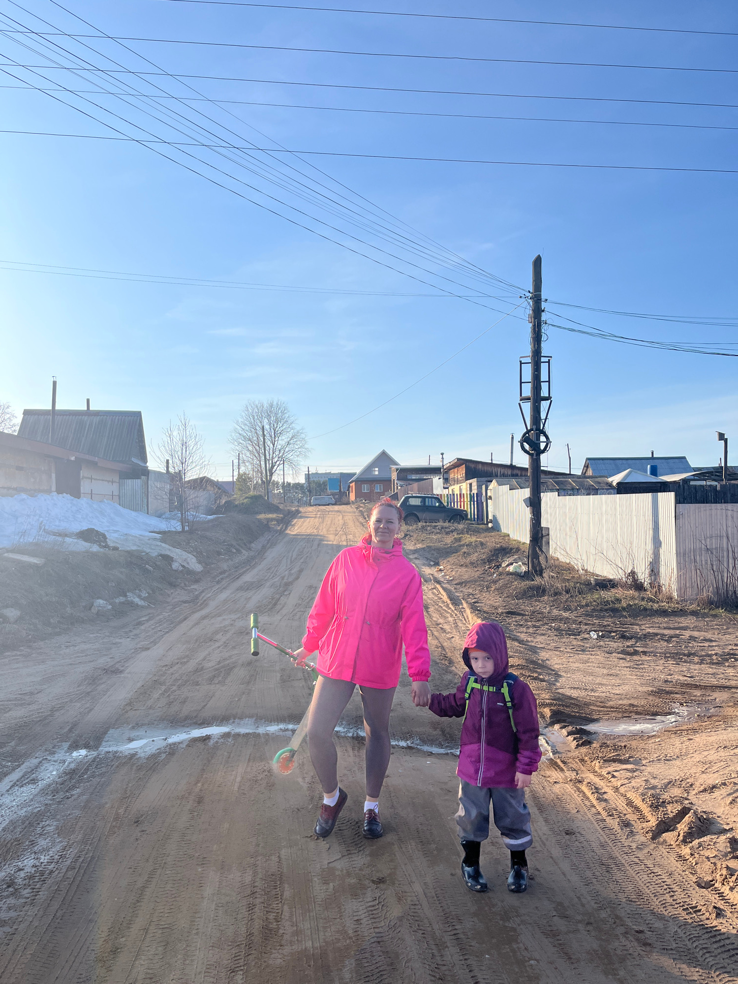 Two people stand on a dirt road in Chaikovsky, Russia. An adult in a bright pink jacket holds the hand of a child in a purple hooded jacket. The road is muddy, with tire tracks and patches of melting…read more