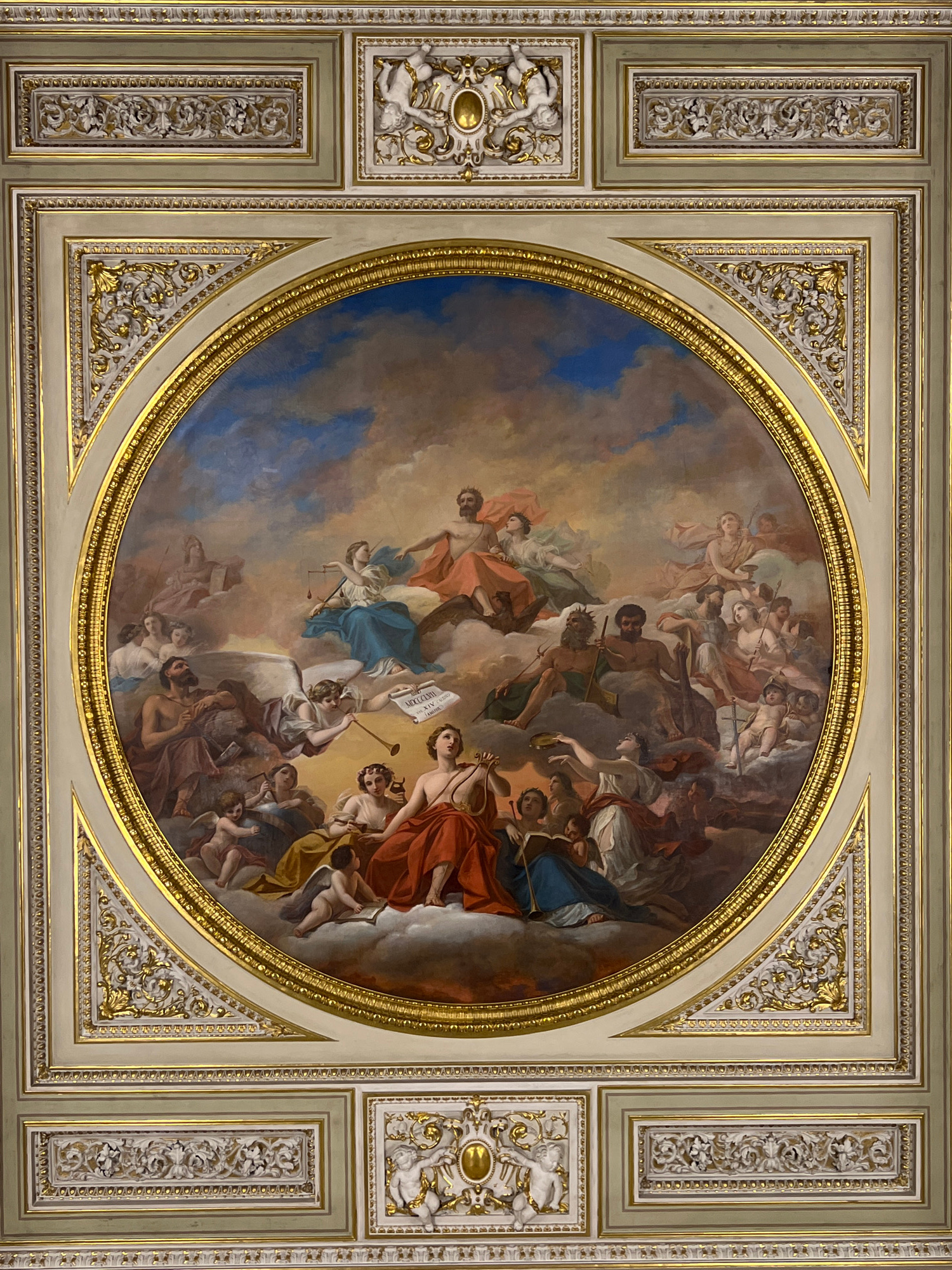The image shows a ceiling painting, possibly a fresco, set within a highly ornate, rectangular frame. The painting is contained within a circular border. The painting depicts a scene filled with figur…read more
